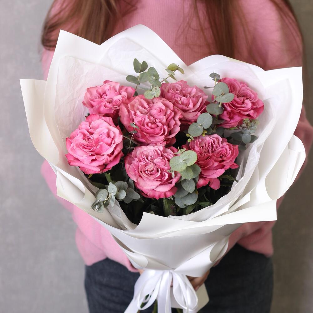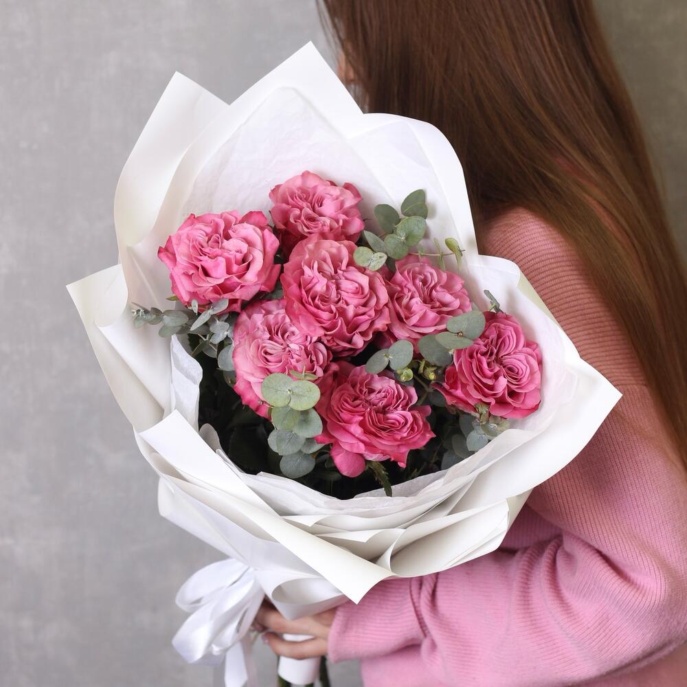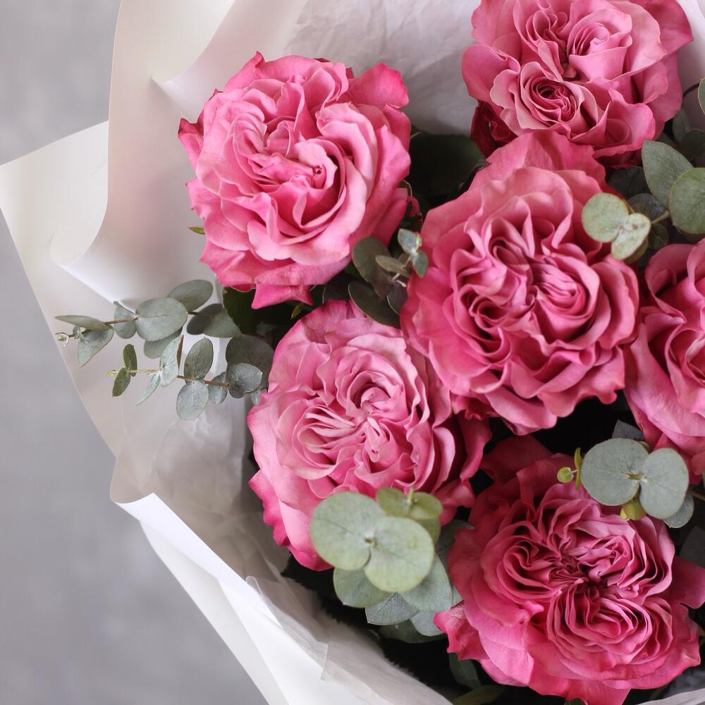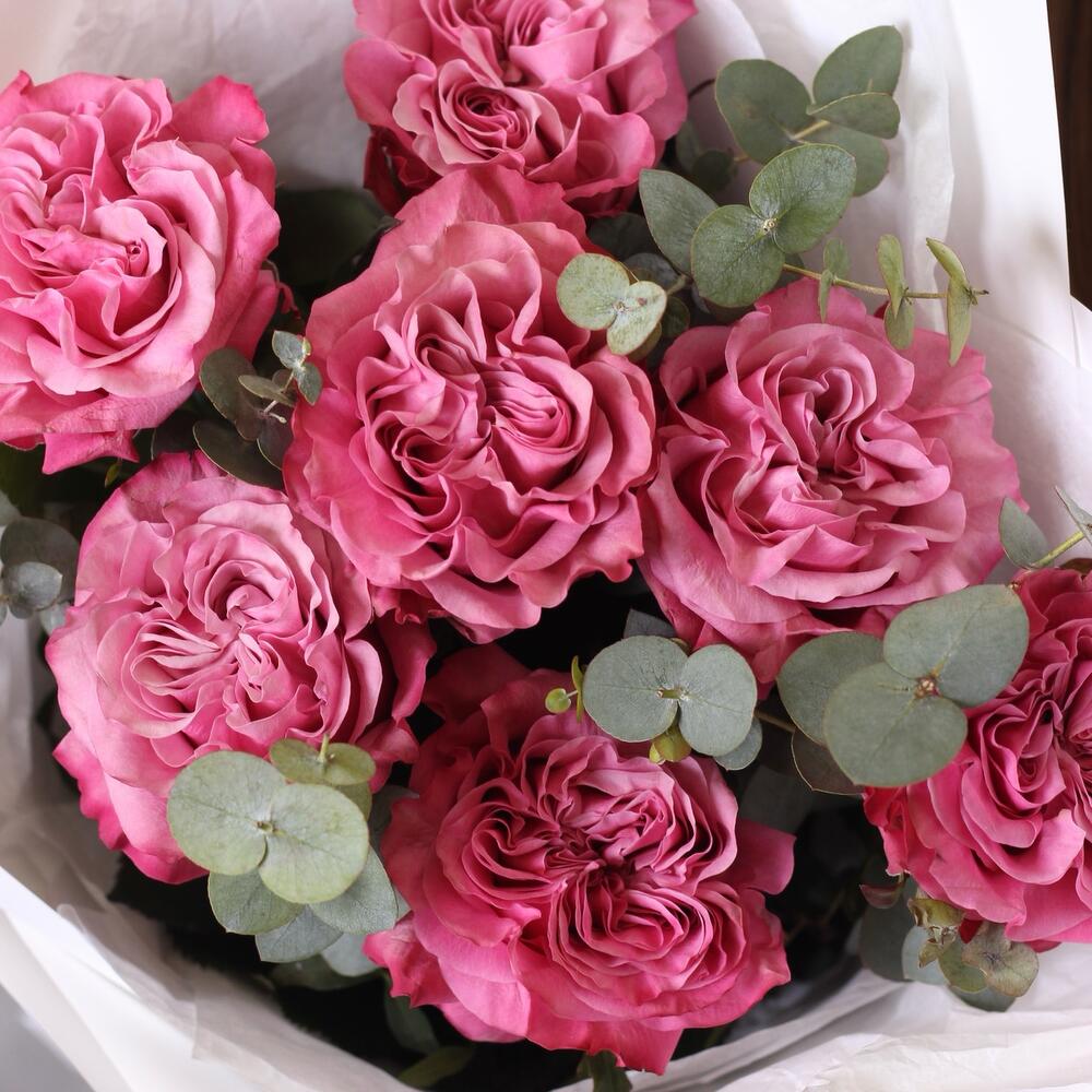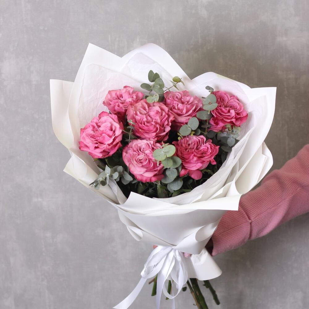Эвкалипт - 2 шт. Тишью белое - 1 шт. Пленка белая - 1 шт. роза кантри блю (пионовидная) - 7 шт.