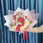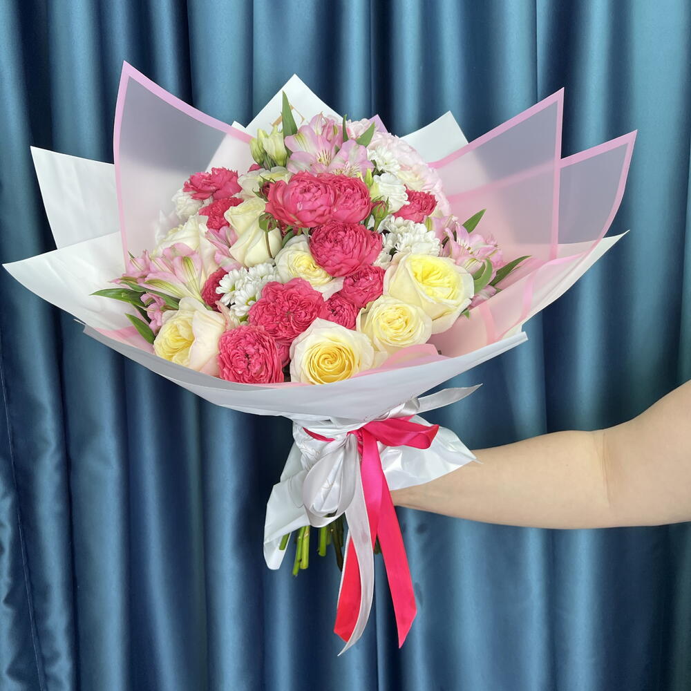 Альстромерия - 3 шт. Гортензия - 1 шт. Писташ - 2 шт. Сантини - 3 шт. Упаковка дизайнерская - 1 шт. Кустовая роза пионовидная - 4 шт. хорошее настроение от наших флористов - 1 шт. кэндилайт роза пионовидная - 9 шт.