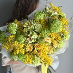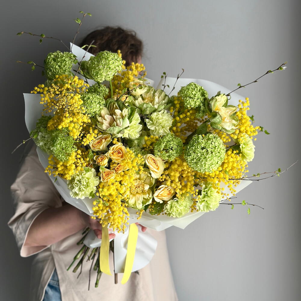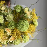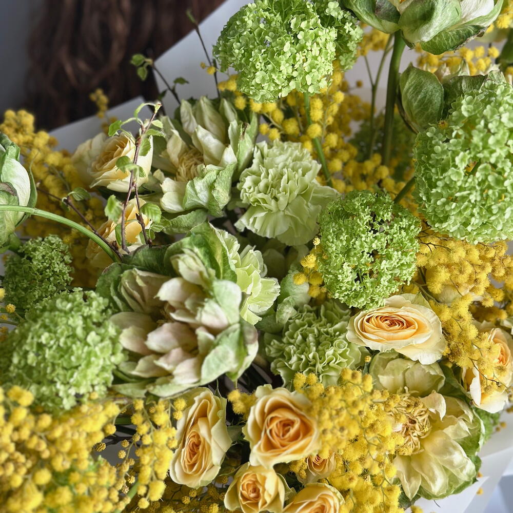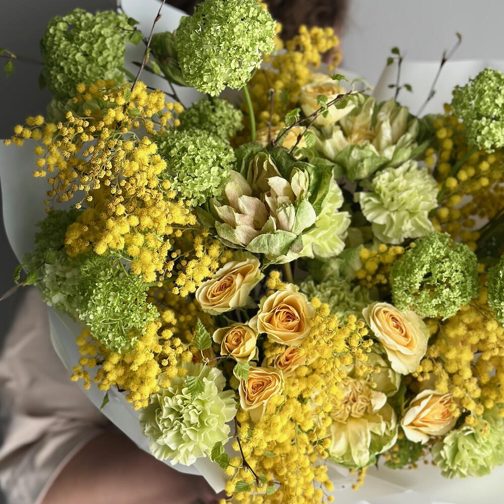 Воздушный букет с оригинальной розой Вегги лаймового цвета с пышными веточками мимозы, которые делают этот букет особенно весенним и ярким, как солнце. Для объема добавлен зеленый вибурнум и диантус, а природную красоту и аромат дают нам веточки липы. Стильная композиция для ваших близких. Цветы - это живые и хрупкие создания. Чтобы они радовали Вас дольше не забывайте ежедневно ухаживать за композицией 💚 Оформляя заказ у нас Вы выбираете уникальность, качество, заботу и быструю бережную доставку цветов до адреса Вашего близкого человека по любому случаю, будь то день рождения, профессиональный праздник, торжество или комплимент без повода. В нашей цветочной мастерской Вы найдёте богатый выбор букетов, композиций, корзин и шляпных коробок с такими цветами как французская роза, ранункулюс, гортензия, хризантема, гвоздика (диантус), гербера, кустовая и пионовидная роза, которым аккомпанирует эвкалипт, молюцелла, вибурнум, писташ. В состав наших букетов и композиций входят самые интересные сорта из Голландии, Италии, Эквадора, Колумбии и других плантаций разных стран, а также локальные фермерские цветы премиального качества, которые смогут выразить Ваши самые глубокие, тëплые или смелые чувства.