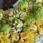 Солнечный букет с мимозой и розой Вегги в желто-зеленой гамме