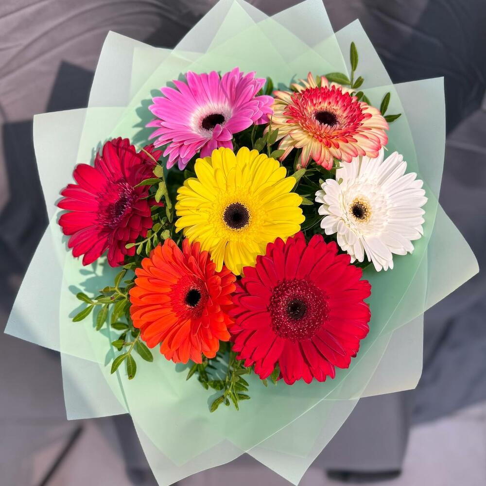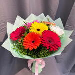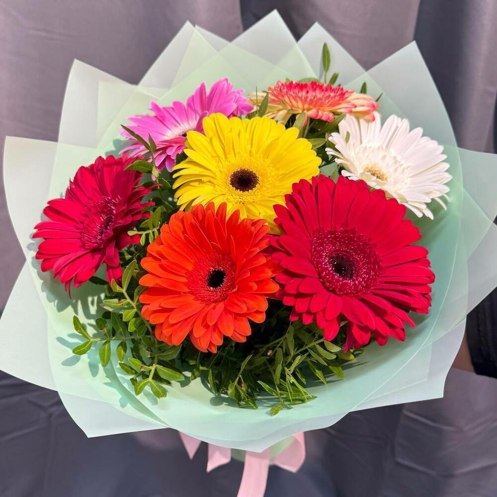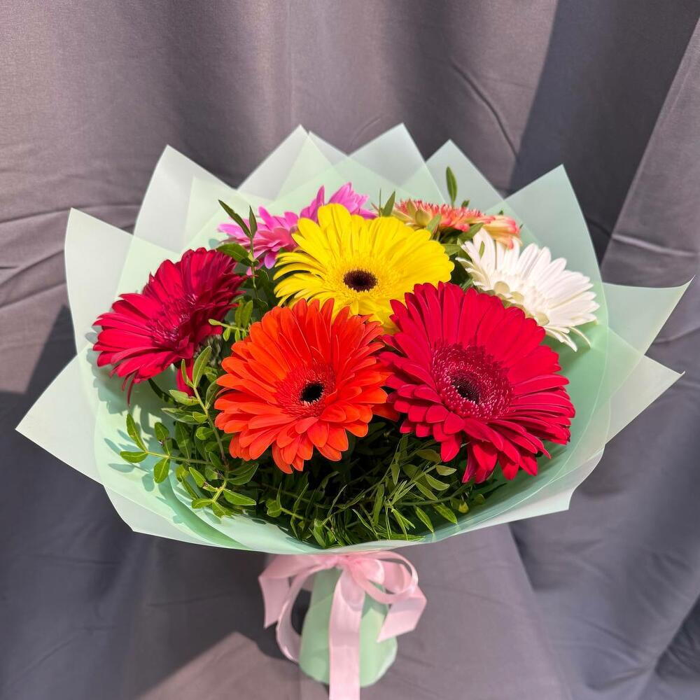 Атласная лента - 1 шт. Упаковка дизайнерская - 1 шт. Гербера Микс - 7 шт. зелень писташ - 3 шт.