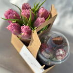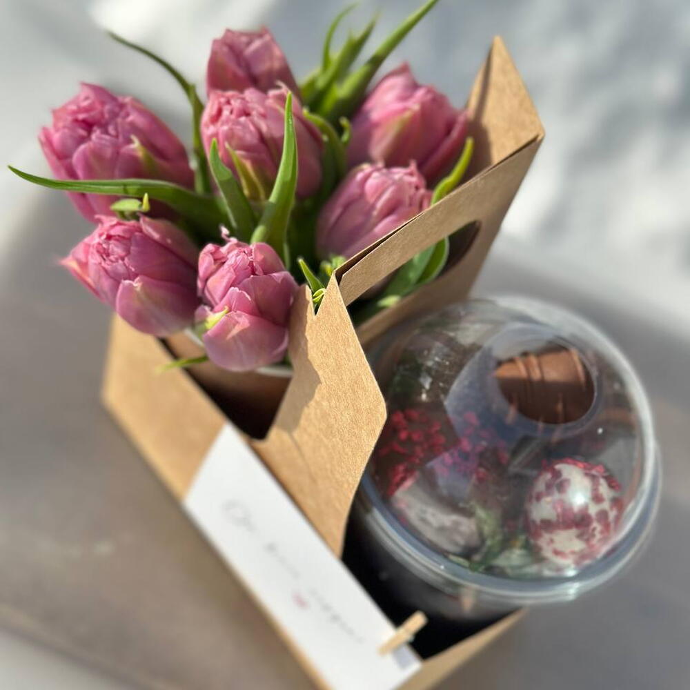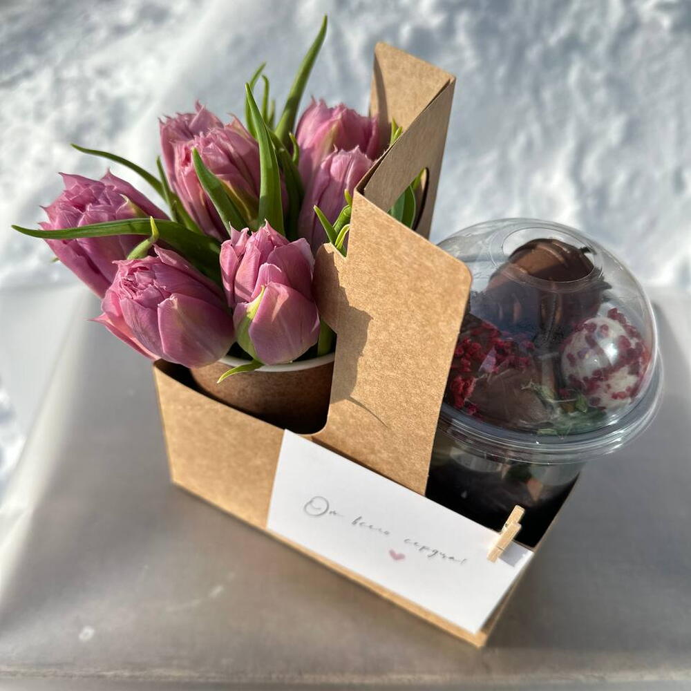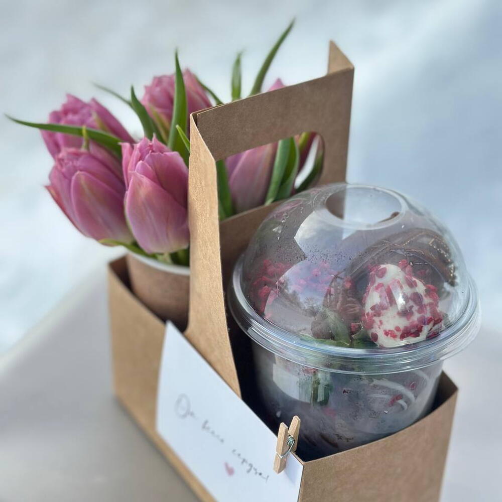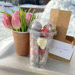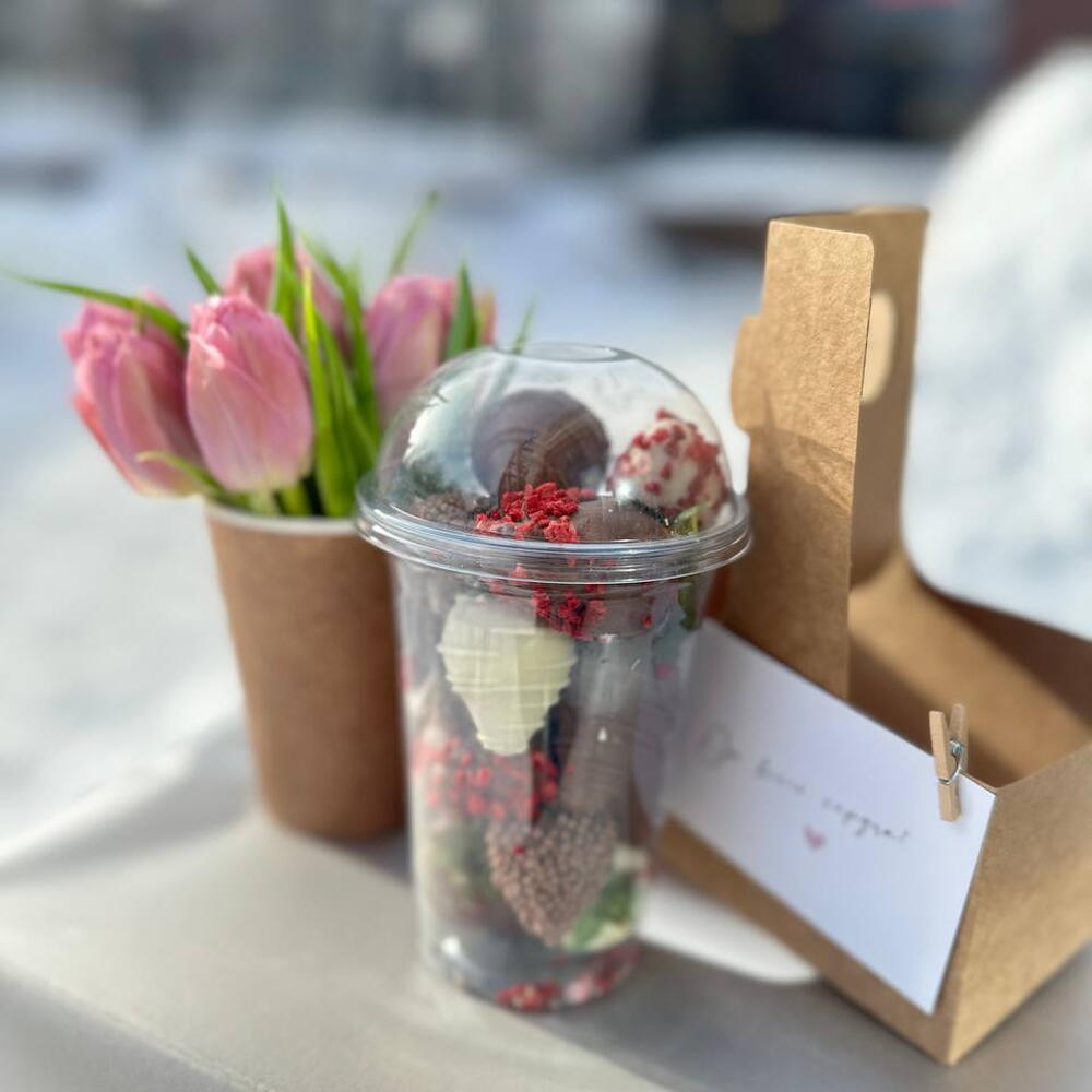 200 г клубники + шоколад + посыпки. Цветы в стаканчике. Удобная переноска на два стаканчика. Милая открытка на деревянной прищепке. ХРАНЕНИЕ Цветы в коробке / корзине уже находятся в специальной флористической губке, наполненной водой. Ежедневно подливайте воду внутрь коробки (от 50 мл), чтобы цветы могли пить. Не оставляйте цветы на сквозняке, на морозе, на солнце или рядом с отопительными приборами. Выберите затененное прохладное место.