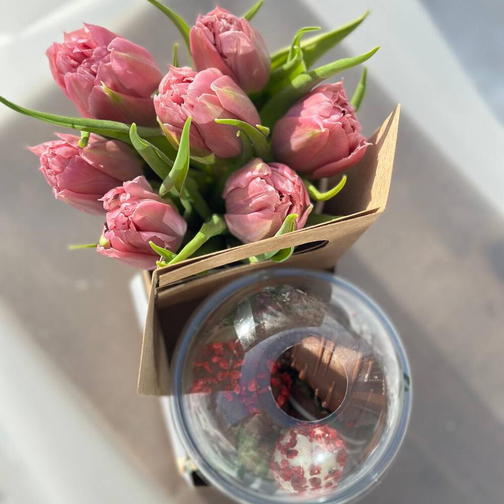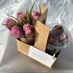 Клубника в шоколаде - 300 гр. тюльпаны в стакане - 7 шт.