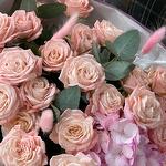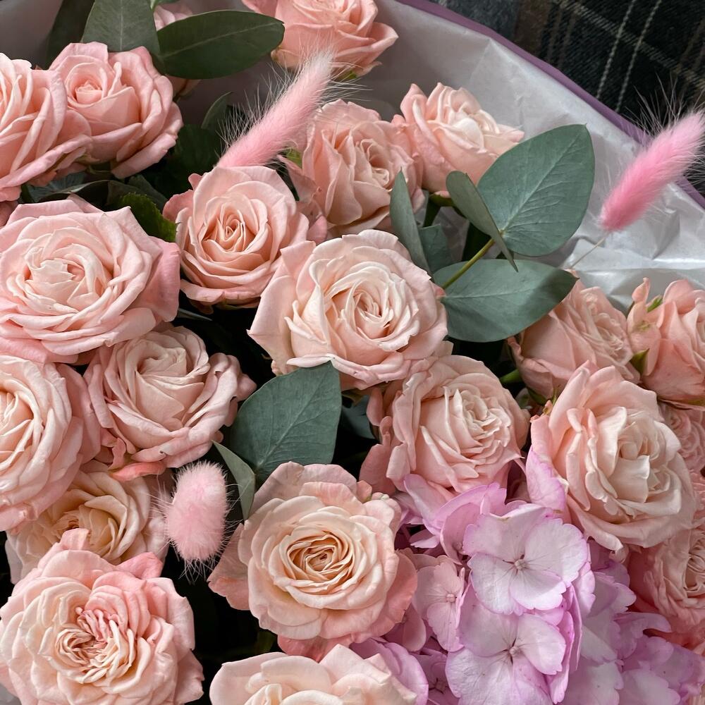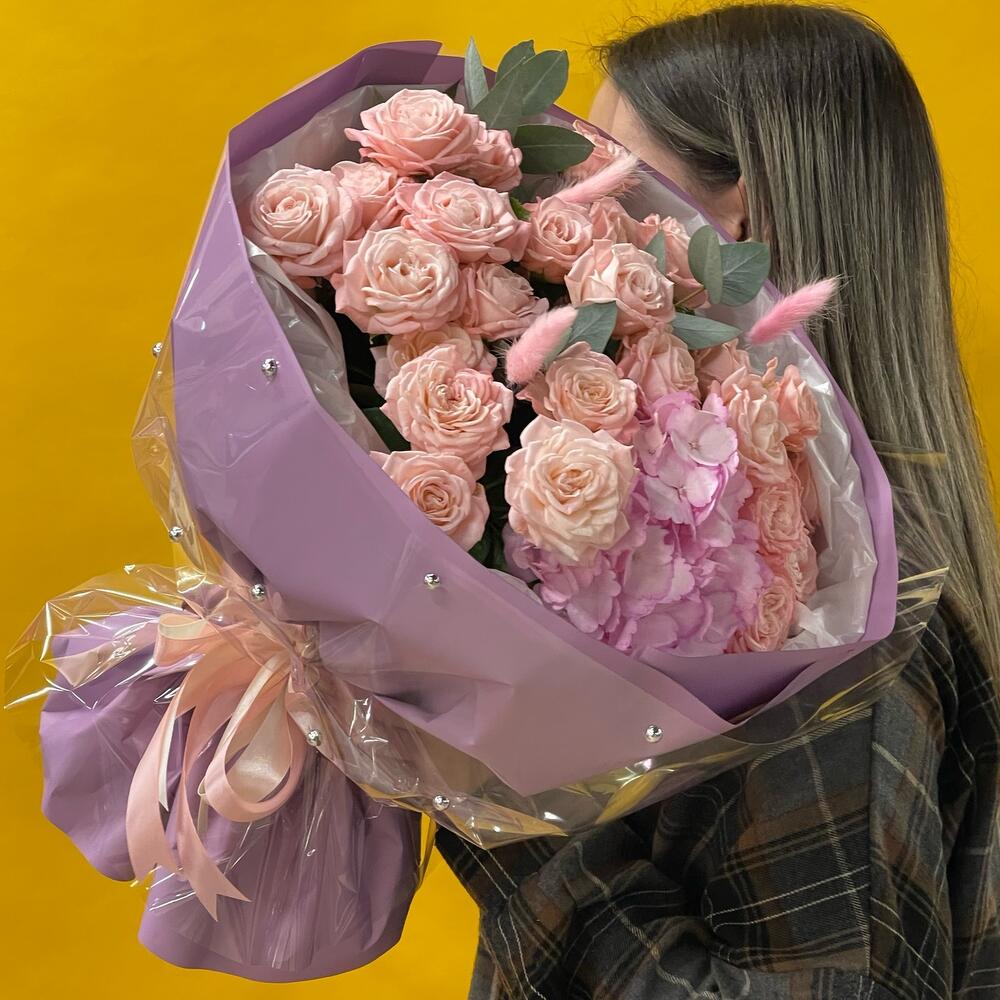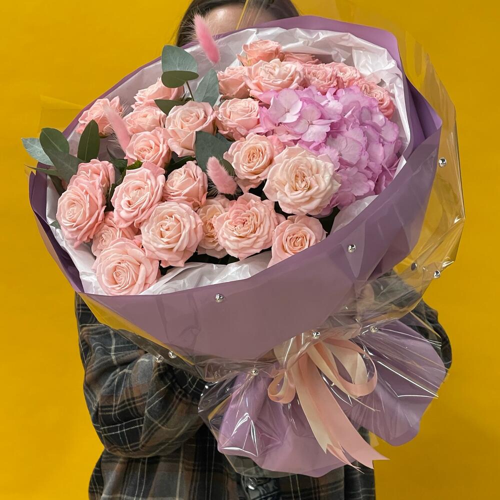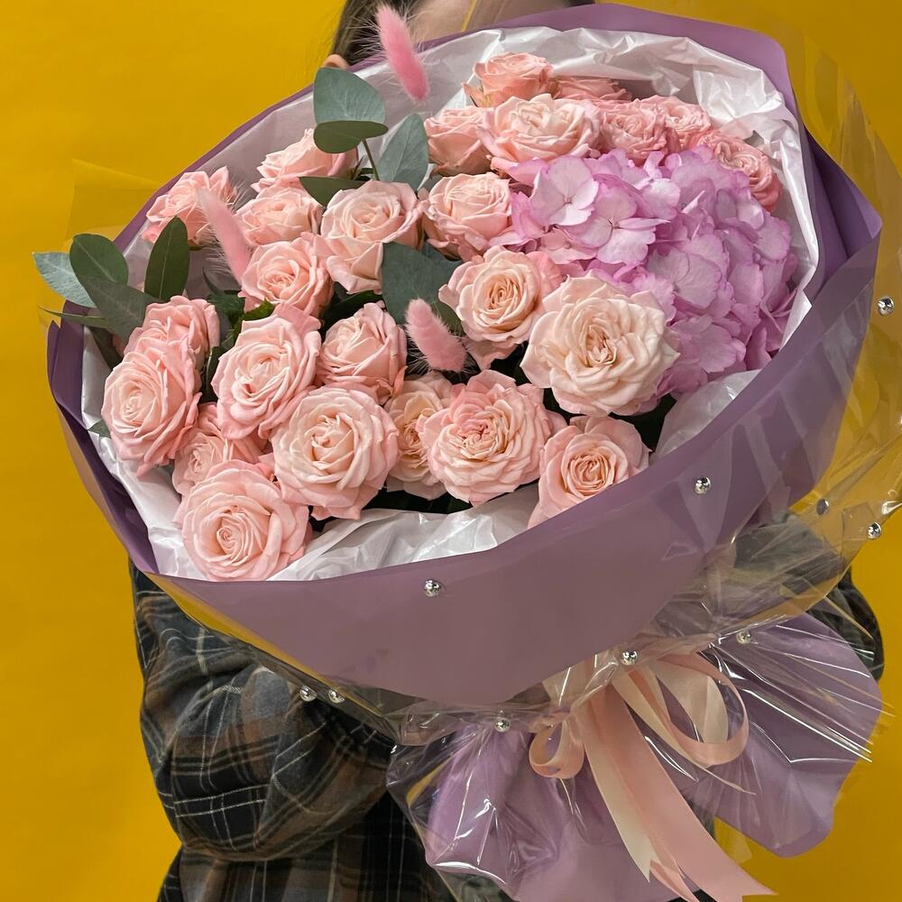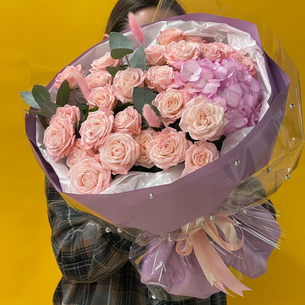 Нежные кустовые розы с гортензией порадуют любого получателя
