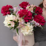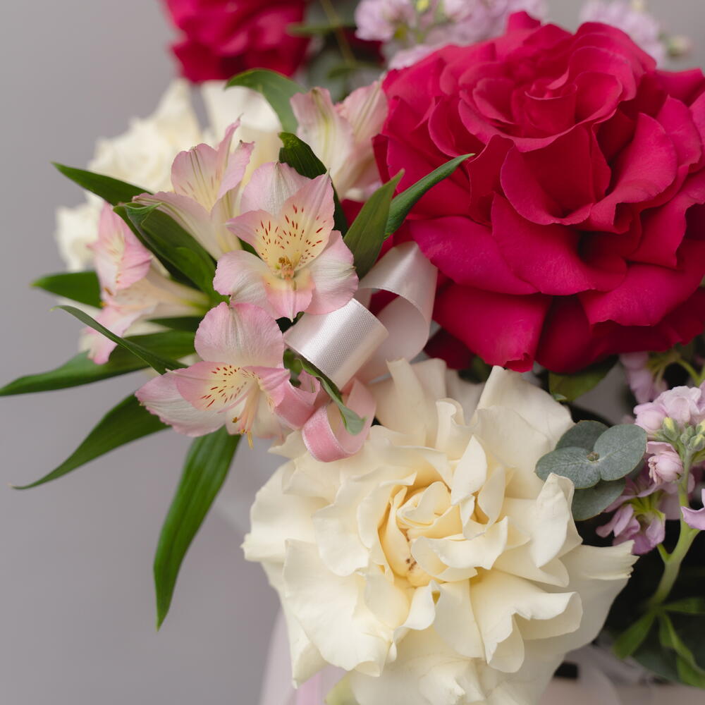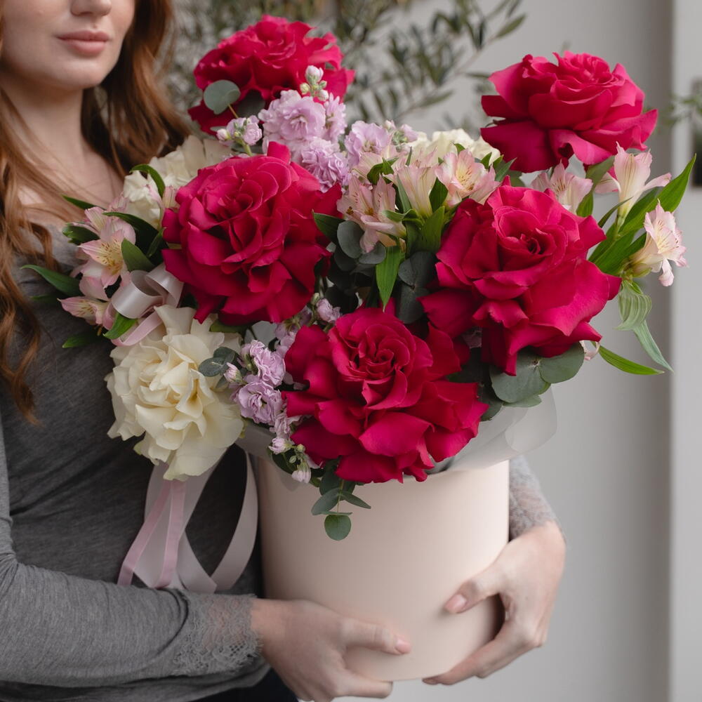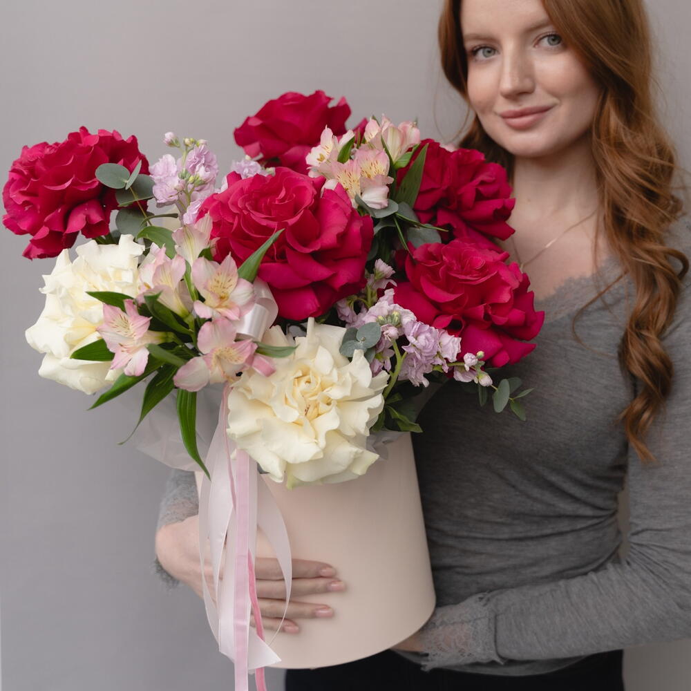Нежный и яркий букет с розами в шляпной коробке — универсальный подарок для мамы, бабушки, близкого человека или коллеги. Подойдёт на день рождения, праздник или как знак внимания. Собирается вручную из свежих цветов. Подойдет к 14 февраля и ко Дню Святого Валентина.