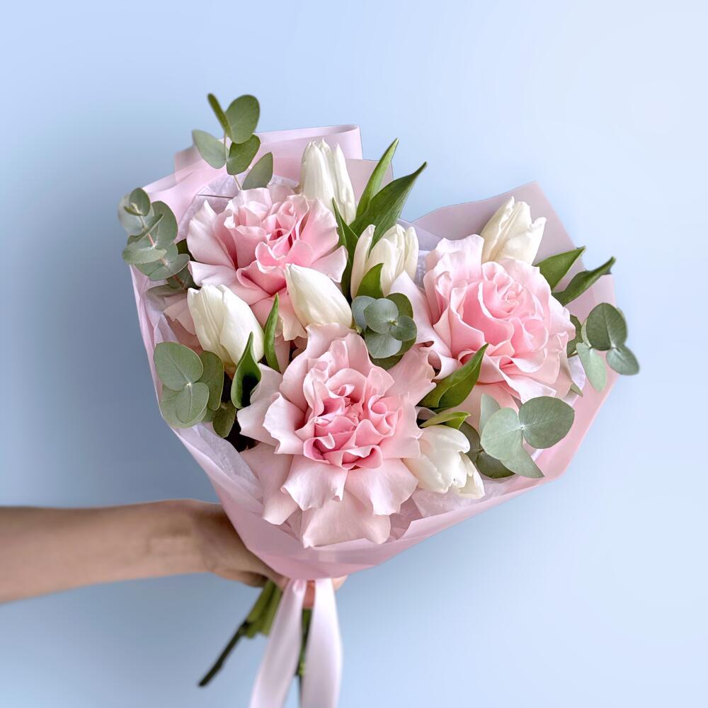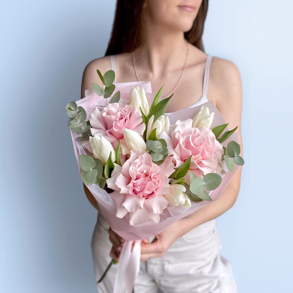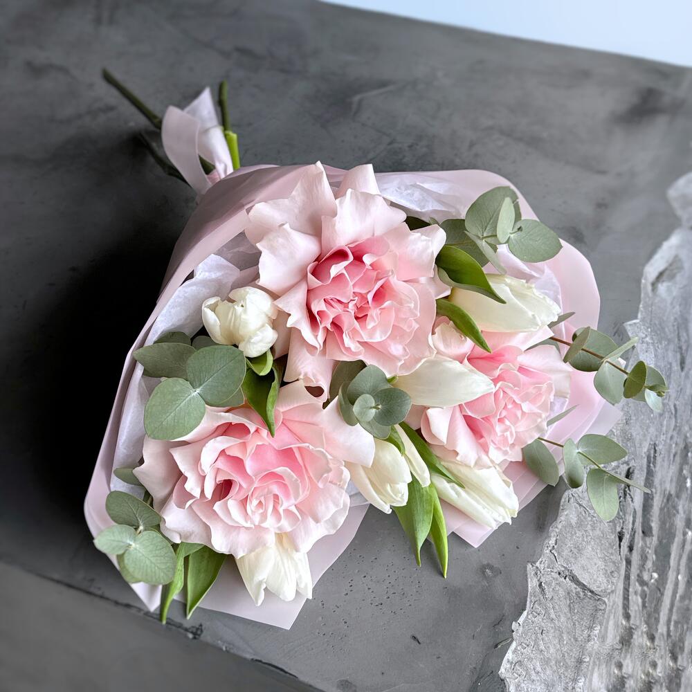 Стильный супер нежный букет тюльпаны, французские розы и эвкалипт