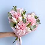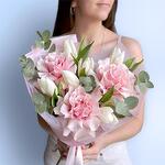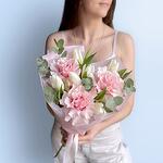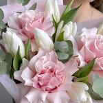 Нежный букет в пастельных тонах из розовых французских роз, белых тюльпанов и эвкалипта :) Не забудьте подрезать цветы перед тем как ставить в вазу. Не храните букет на прямых солнечных лучах и возле отопительных приборов, чтобы сохранить цветы свежими как можно дольше. Обратите внимание на фото в полный рост и написанные размеры товара.