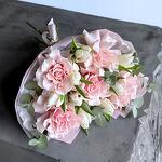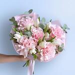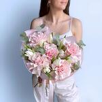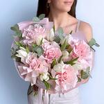 Нежный букет в пастельных тонах из розовых французских роз, белых тюльпанов и эвкалипта :) Не забудьте подрезать цветы перед тем как ставить в вазу. Не храните букет на прямых солнечных лучах и возле отопительных приборов, чтобы сохранить цветы свежими как можно дольше. Обратите внимание на фото в полный рост и написанные размеры товара.