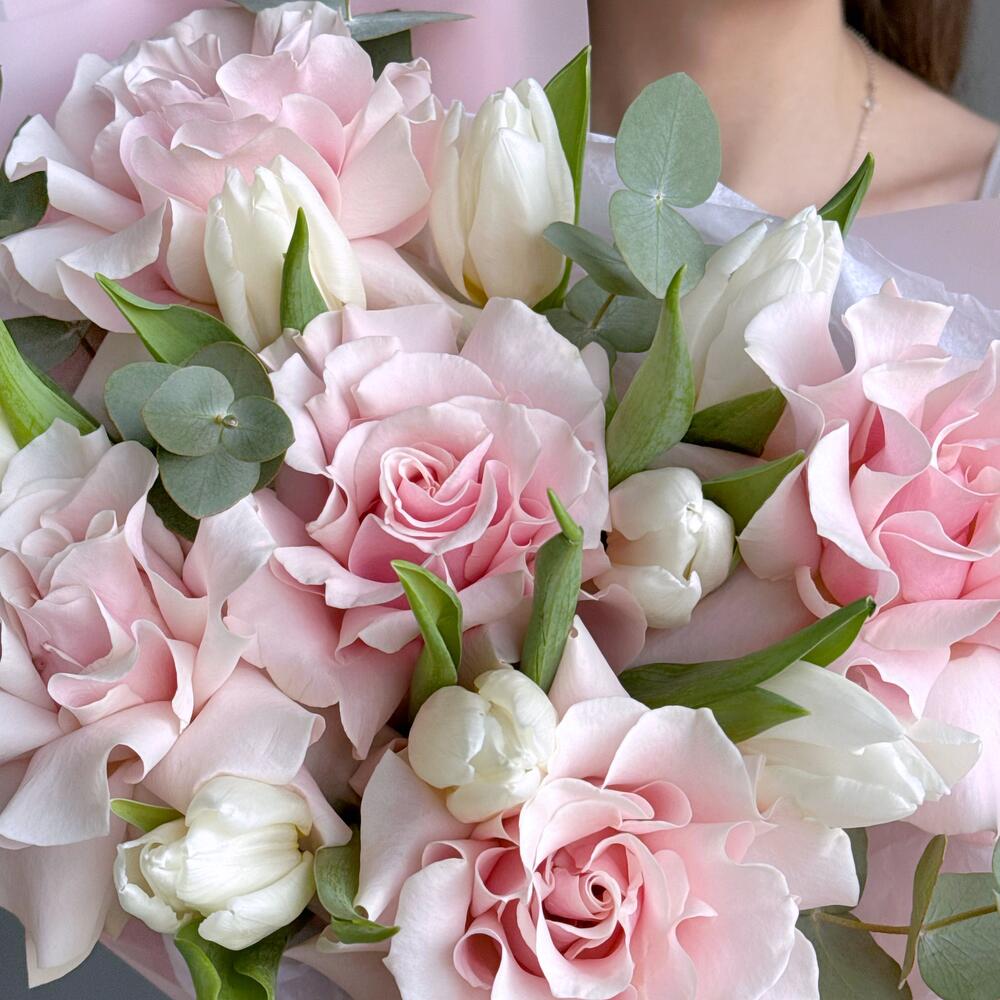 Стильный нежный букет тюльпаны, французские розы и эвкалипт