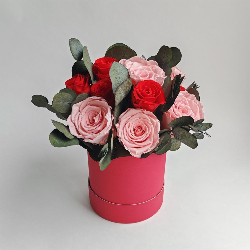 Стабилизированные розы в шляпной коробке с эвкалиптом