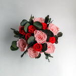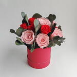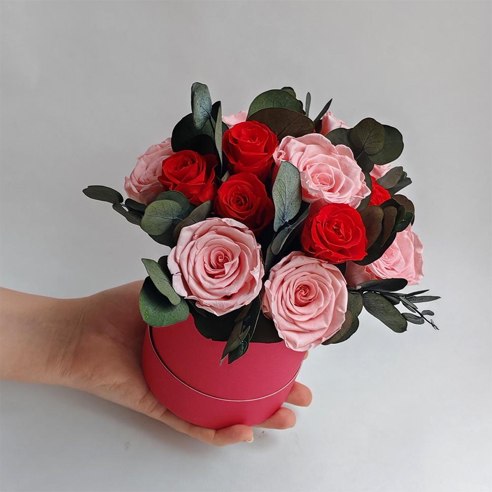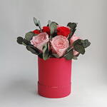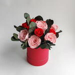 Стабилизированные розы в шляпной коробке - лучший подарок для дня матери или просто любимому человеку. Эта композиция из стабилизированных цветов — квинтэссенция страсти и нежности: алые и нежно-розовые стабилизированные розы переплетаются с дымчатыми веточками эвкалипта. Заключенные в стильную красную коробку, они становятся готовым аргументом в споре о том, каким должен быть идеальный подарок. Долговечная красота, не требующая ни капли воды. Размер: Ширина 19 см., высота 21 см. Глубокий красный и мягкий розовый создают сложную, многогранную палитру. Эвкалипт своей приглушенной зеленью добавляет благородства и завершенности. Небольшой, но выразительный размер делает композицию из сухоцветов универсальной: от рабочего стола до изголовья кровати. Идеально для: - Подарка, когда важна безупречная эстетика «из коробки». - Создания стильного акцента в интерьере без лишних хлопот. - Того, кто ценит в вещах долговечность и лаконичный дизайн.