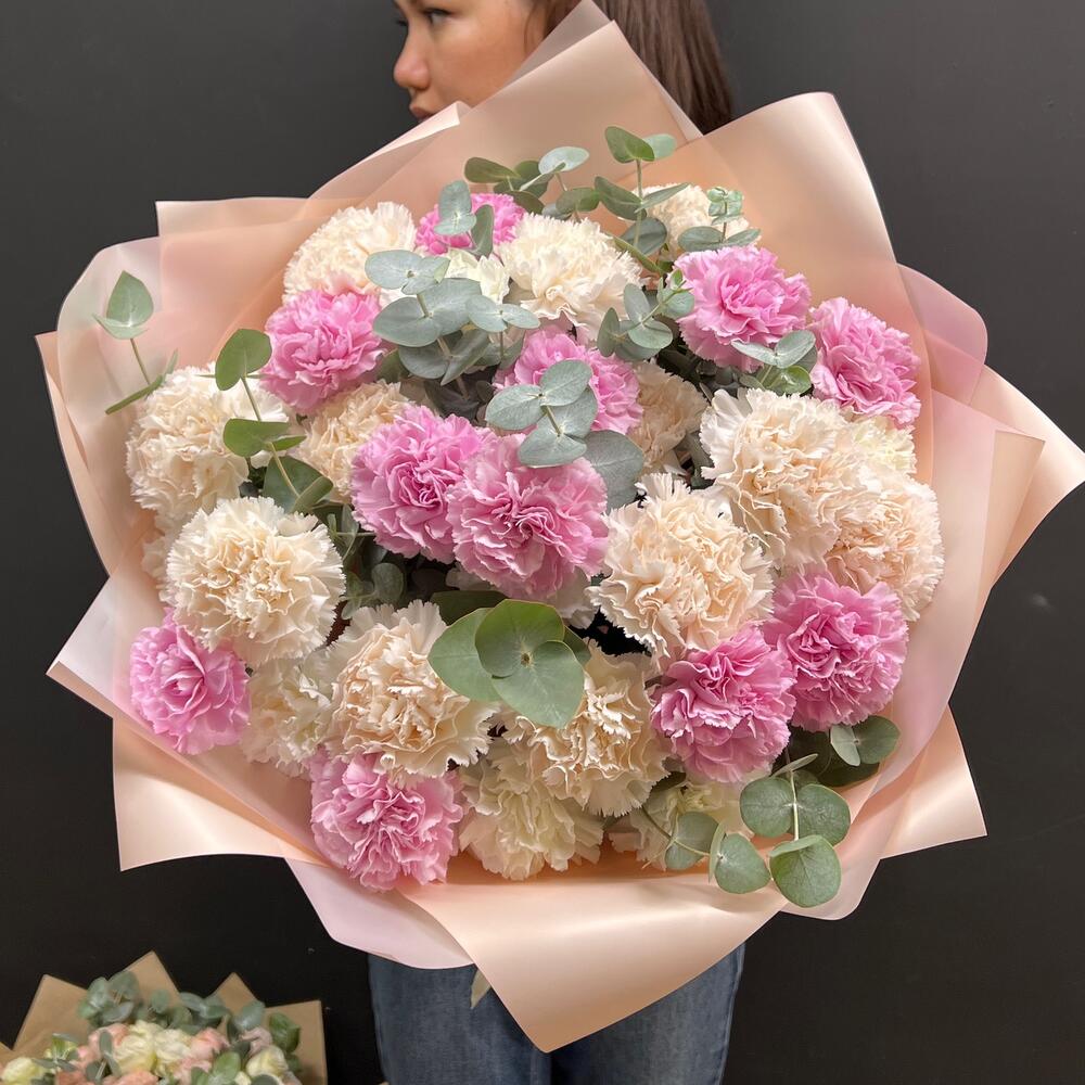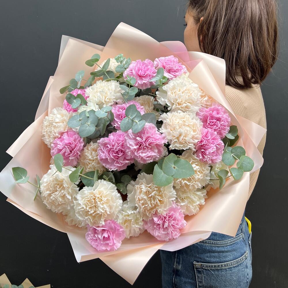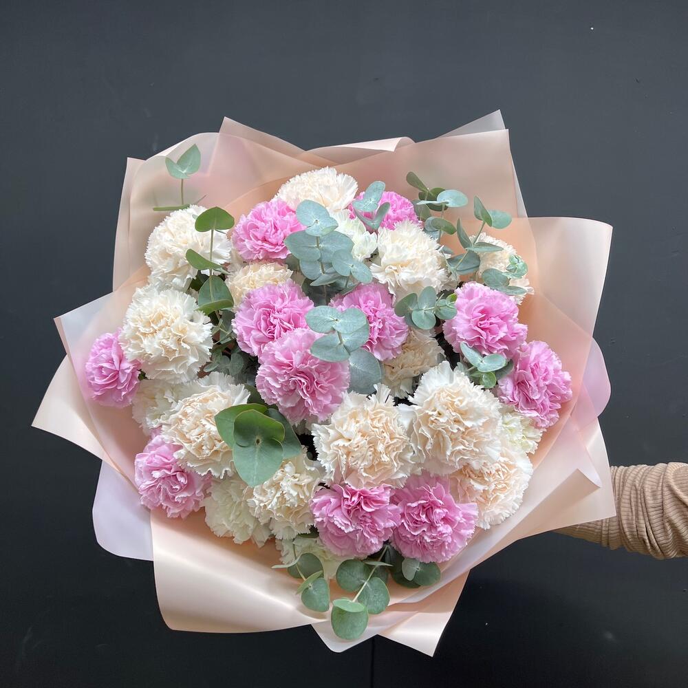 Стойкий и пышный букет диантусов с нежным изысканным ароматом эвкалипта