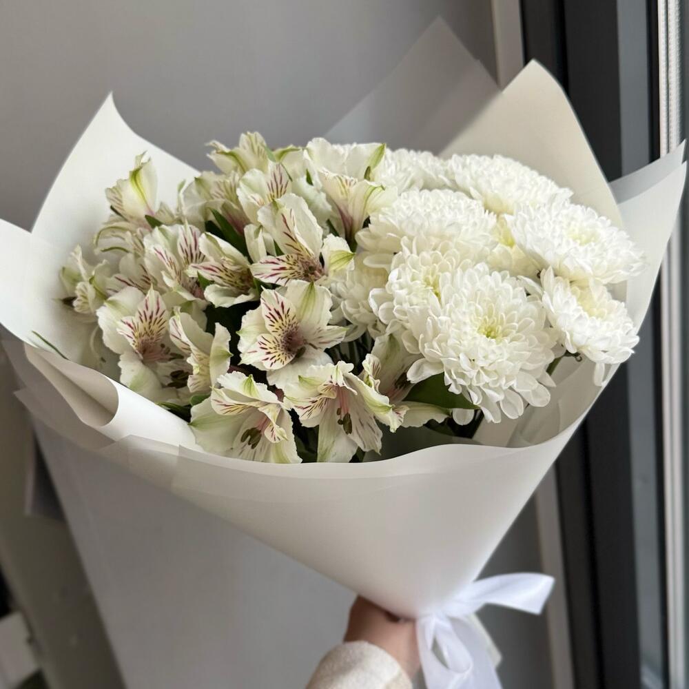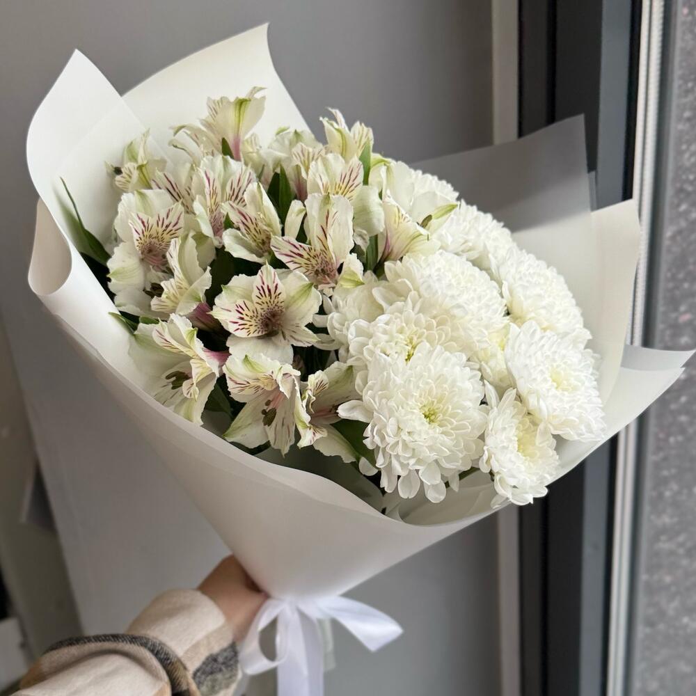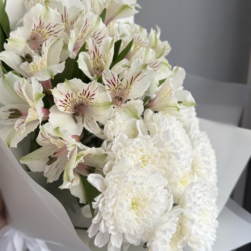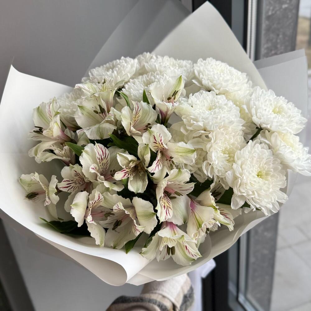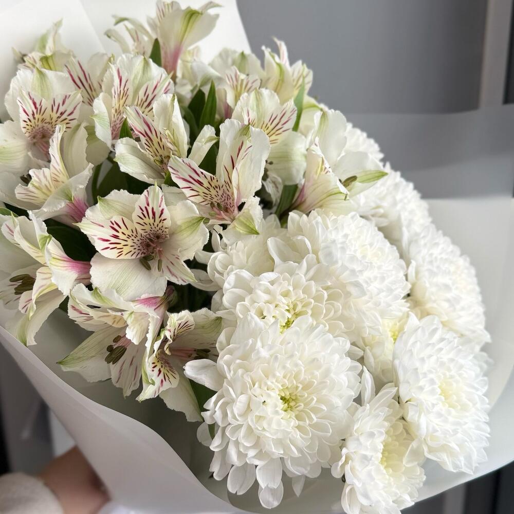 Букет из кустовых хризантем и альстромерий — гармоничная и стойкая композиция, которая сочетает живую текстуру хризантем и лёгкую элегантность альстромерий
