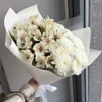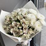 Альстромерия - 4 шт. Хризантема кустовая - 3 шт. Лента атласная - 1 шт. Упаковка дизайнерская - 3 шт.