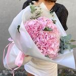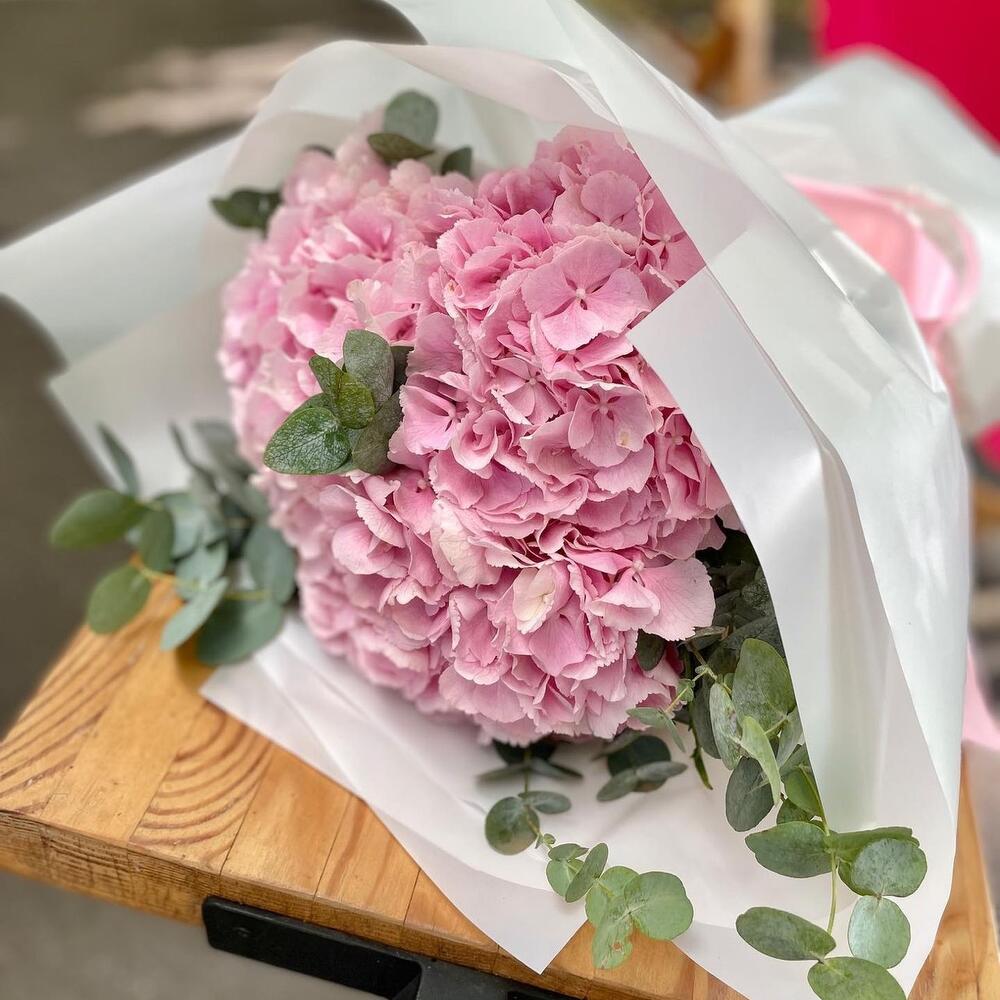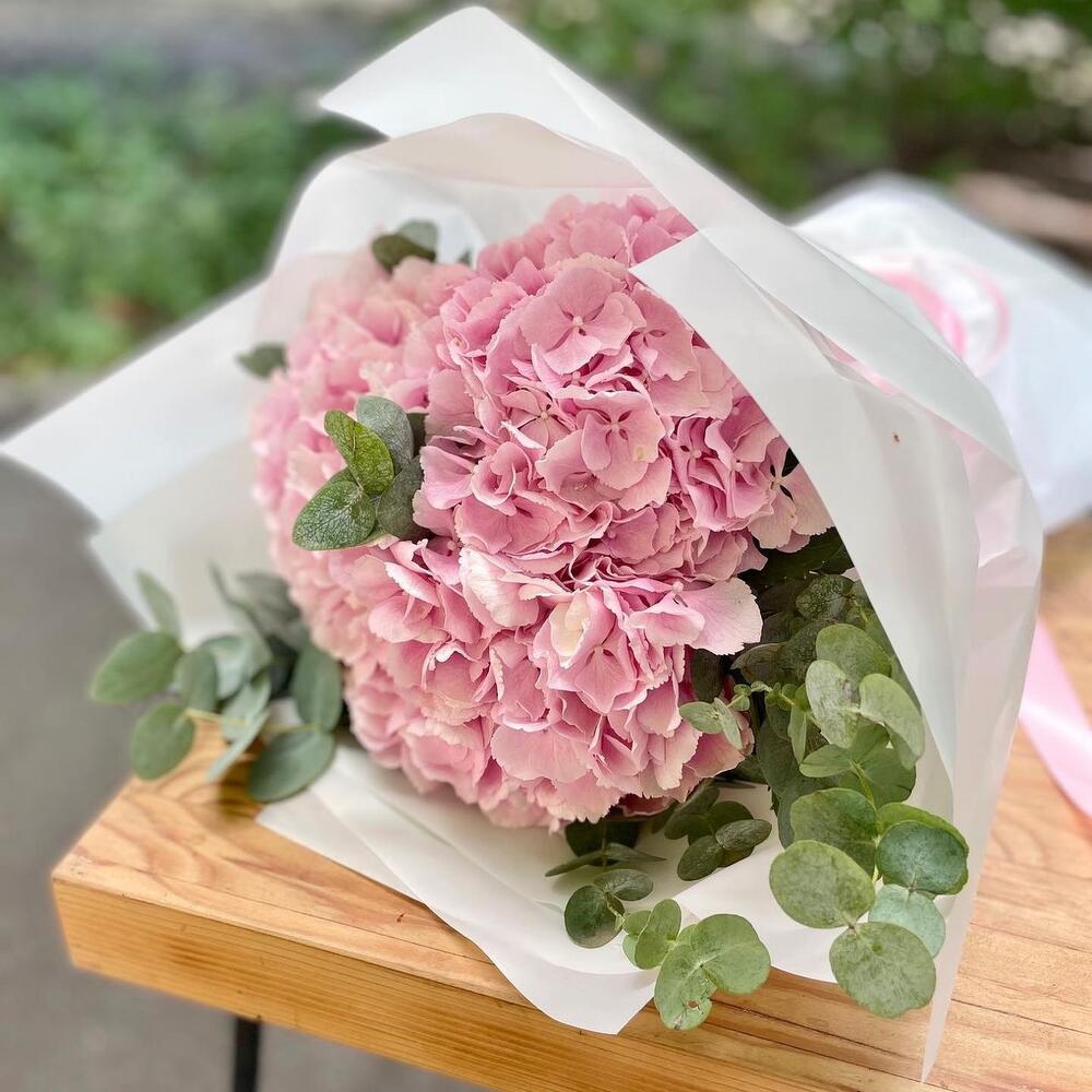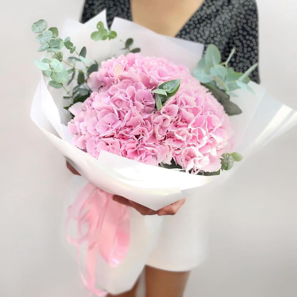 Эвкалипт - 7 шт. Атласная лента - 2 шт. Розовая гортензия - 3 шт. Дизайнерская упаковка - 4 шт.