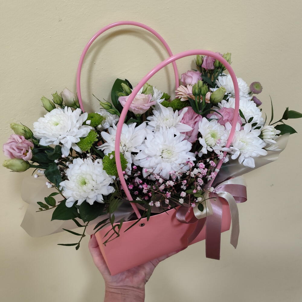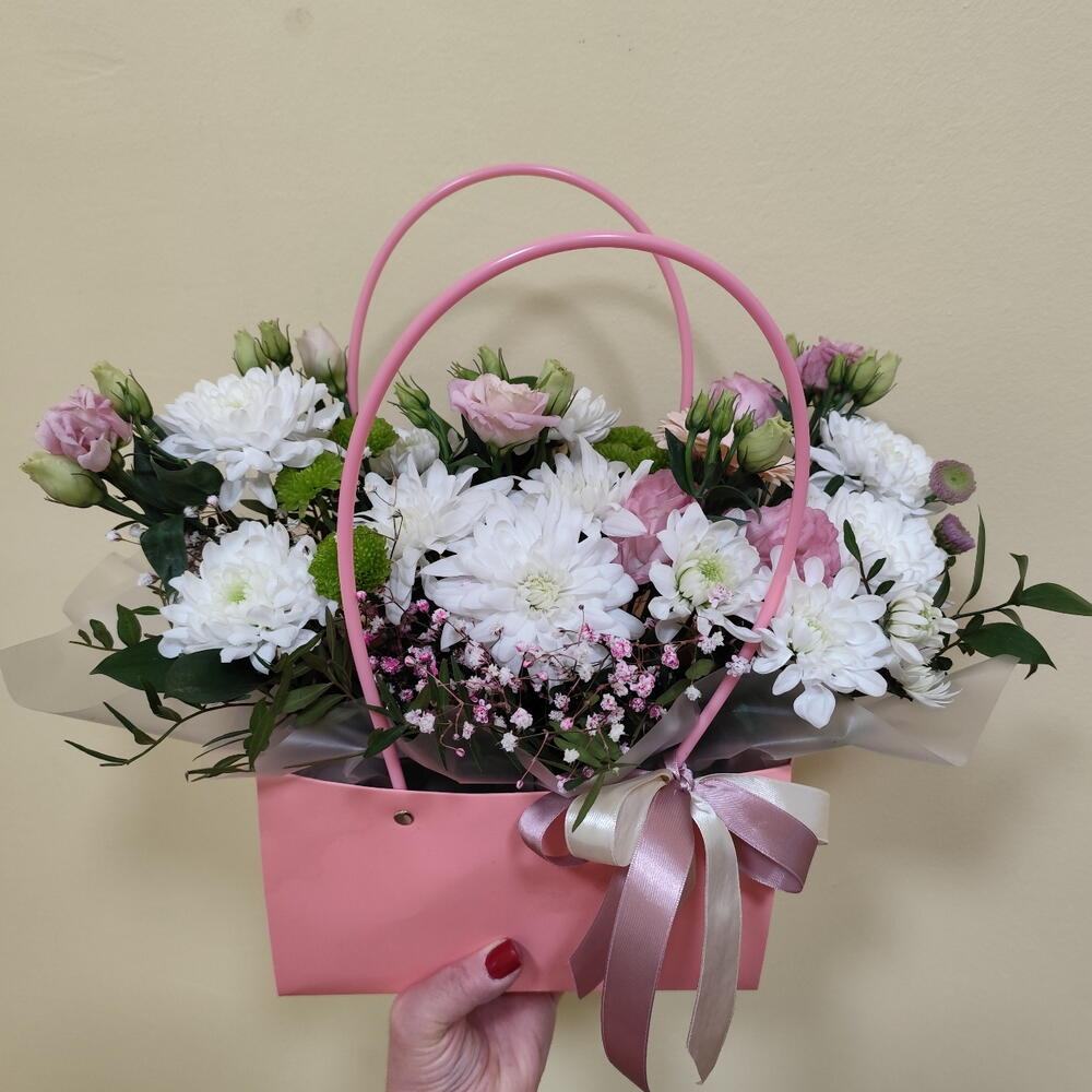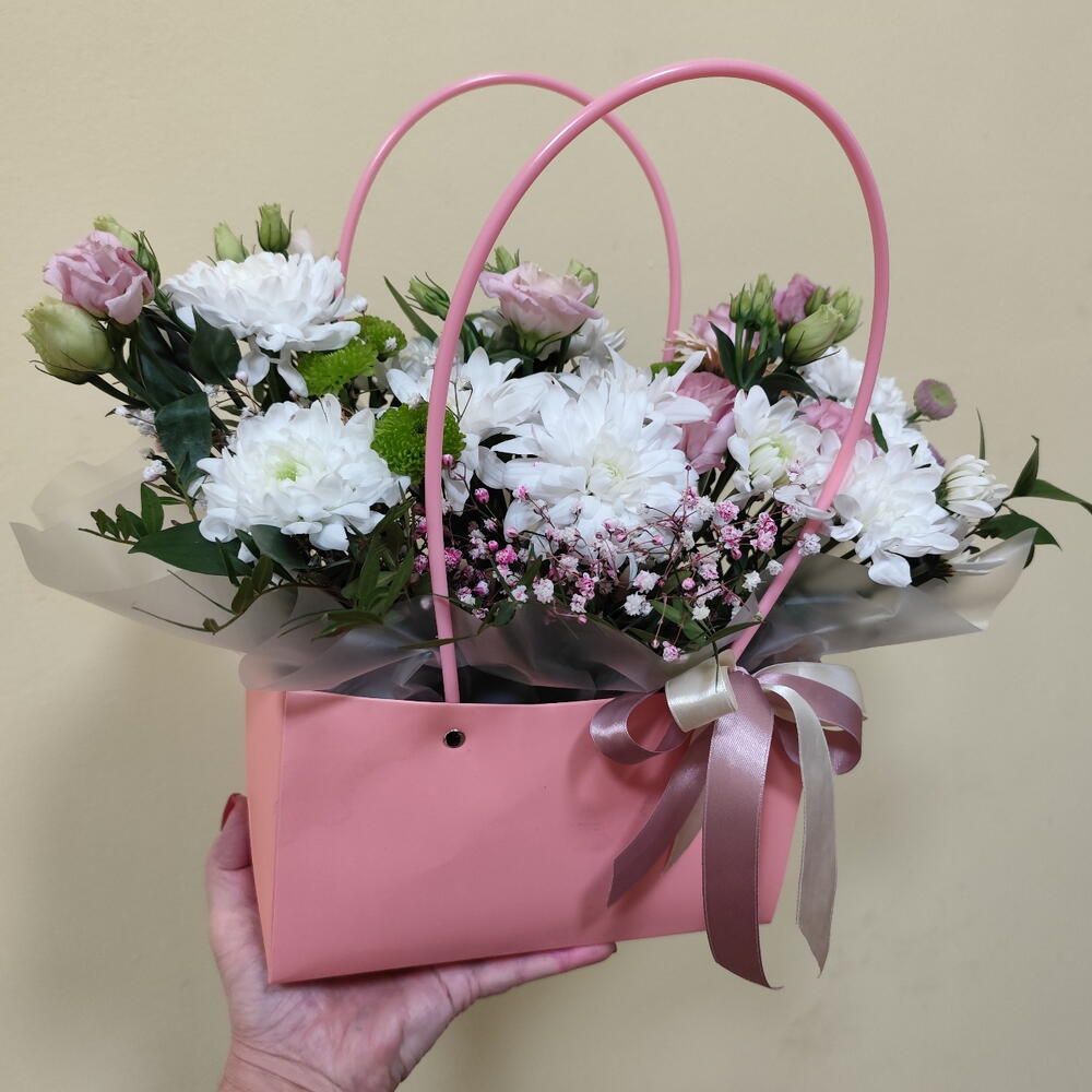 Сумка с цветами из хризантемы,герберы, гипсофилы, рускуса, эустомы, сантини