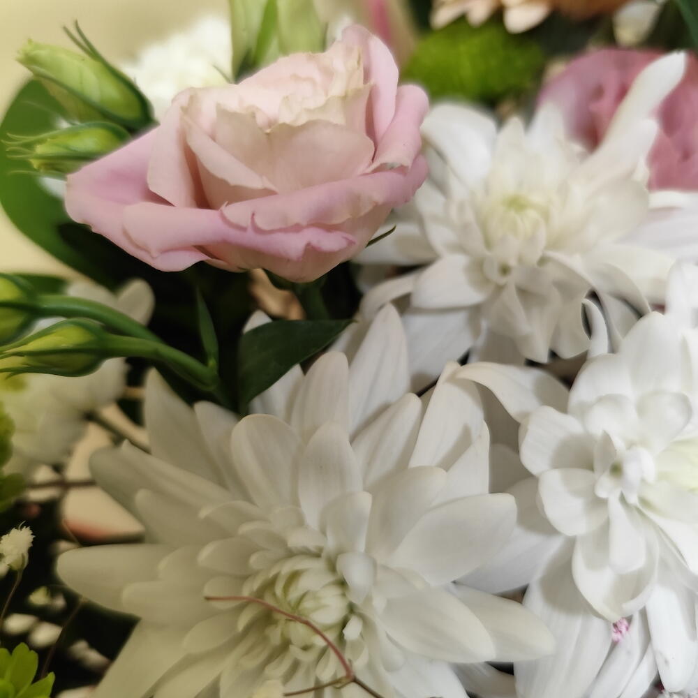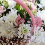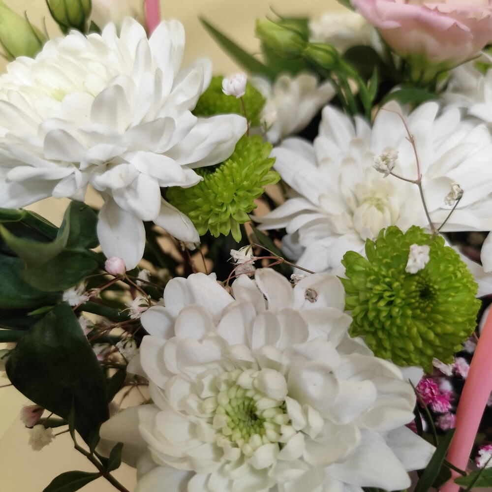 Гипсофила - 1 шт. Рускус - 3 шт. Хризантема кустовая - 2 шт. Лента атласная - 2 шт. Сумка картон - 1 шт. Гербера - 1 шт. Сантини - 1 шт. эустома розовая - 1 шт. Оазис флористический - 1 шт.
