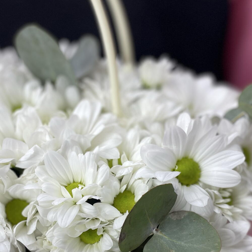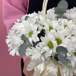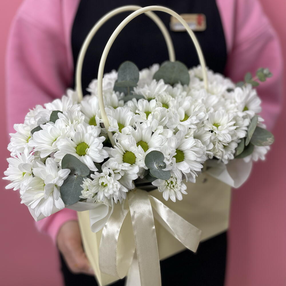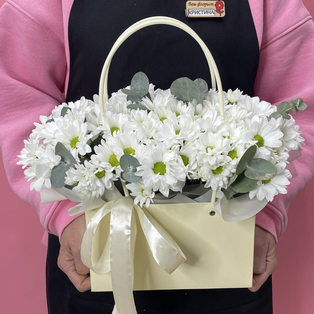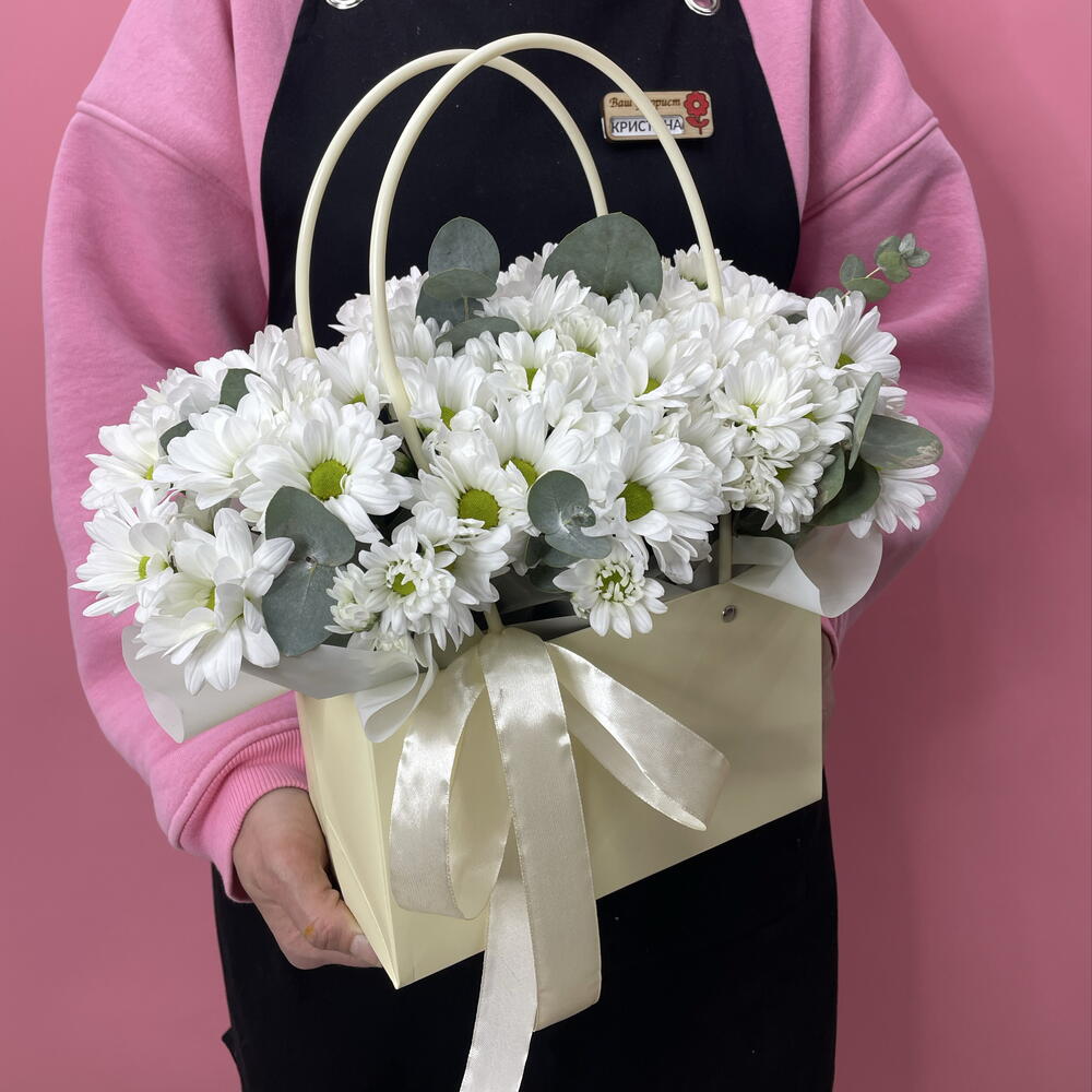 Хризантема кустовая - 5 шт. Лента атласная - 1 шт. Сумка - 1 шт. Эвкалипт Микс - 2 шт.