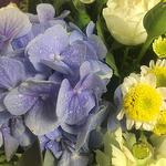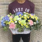 Писташ - 7 шт. Питтоспорум - 7 шт. Кустовая роза - 5 шт. Диантус - 11 шт. Корзина плетеная - 1 шт. Флористический оазис - 2 шт. Гортензия голубая - 3 шт. Сантиния - 9 шт. эустома белая и фиолетовая - 5 шт.