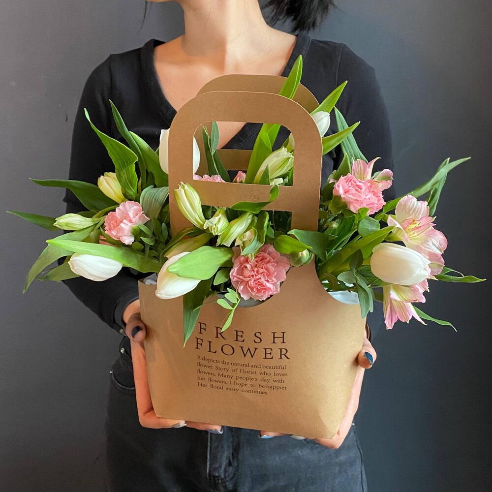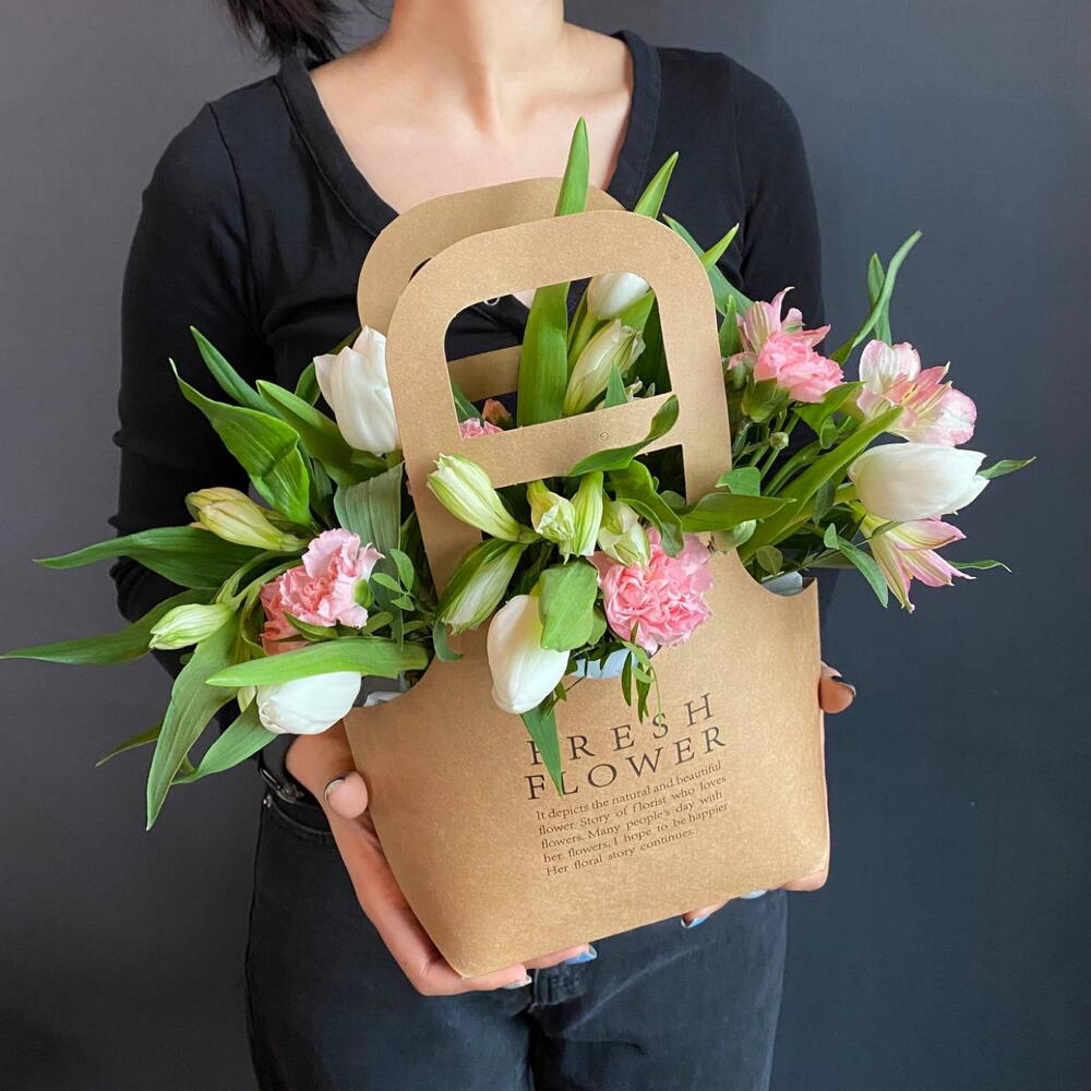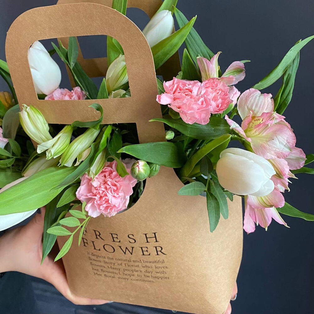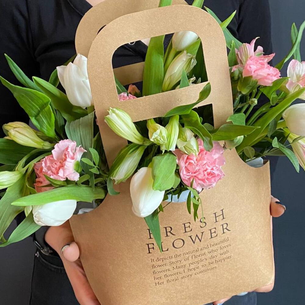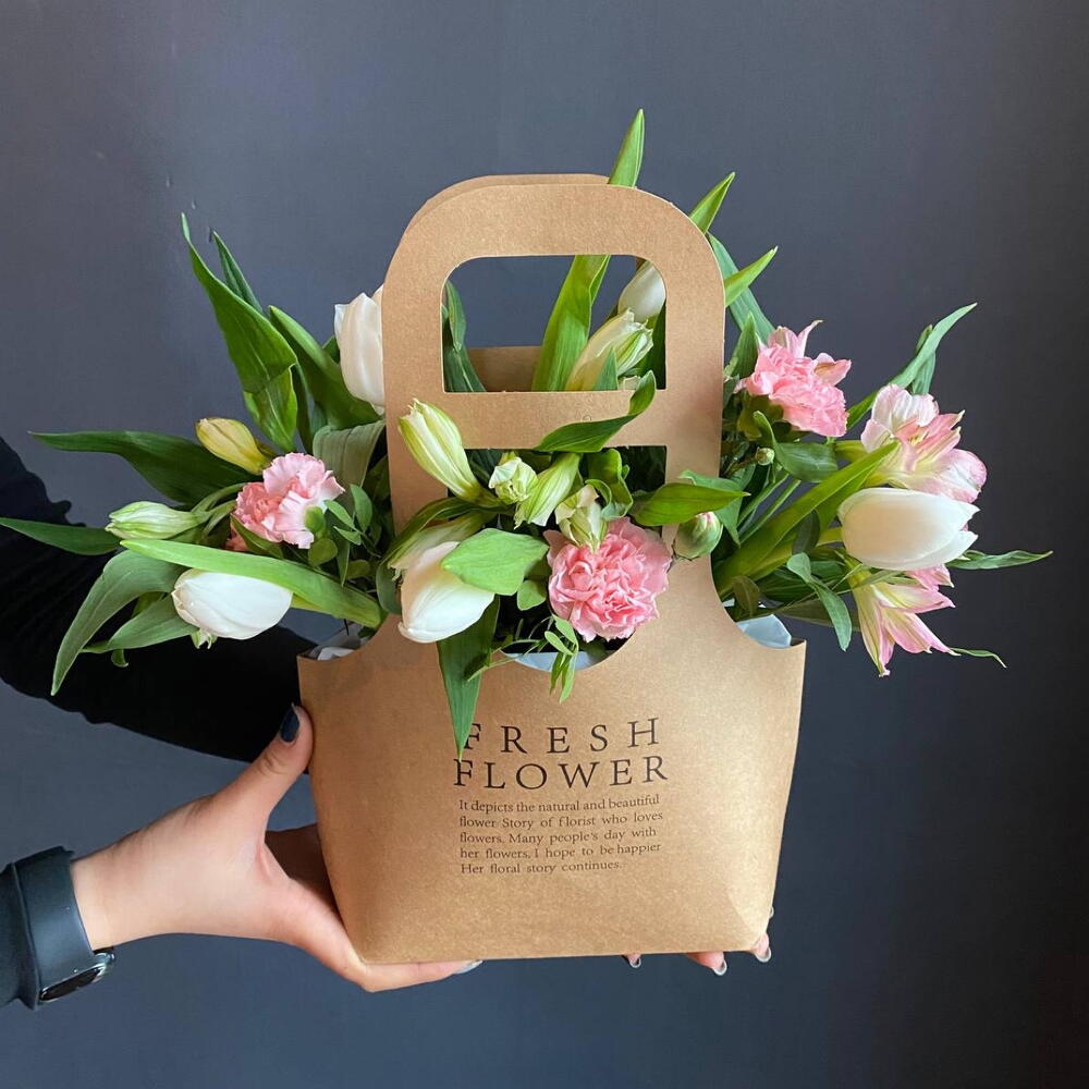 Альстромерия - 2 шт. Писташ - 2 шт. Тюльпан - 5 шт. Диантус - 2 шт. Оазис флористический - 1 шт. Сумка крафт - 1 шт.
