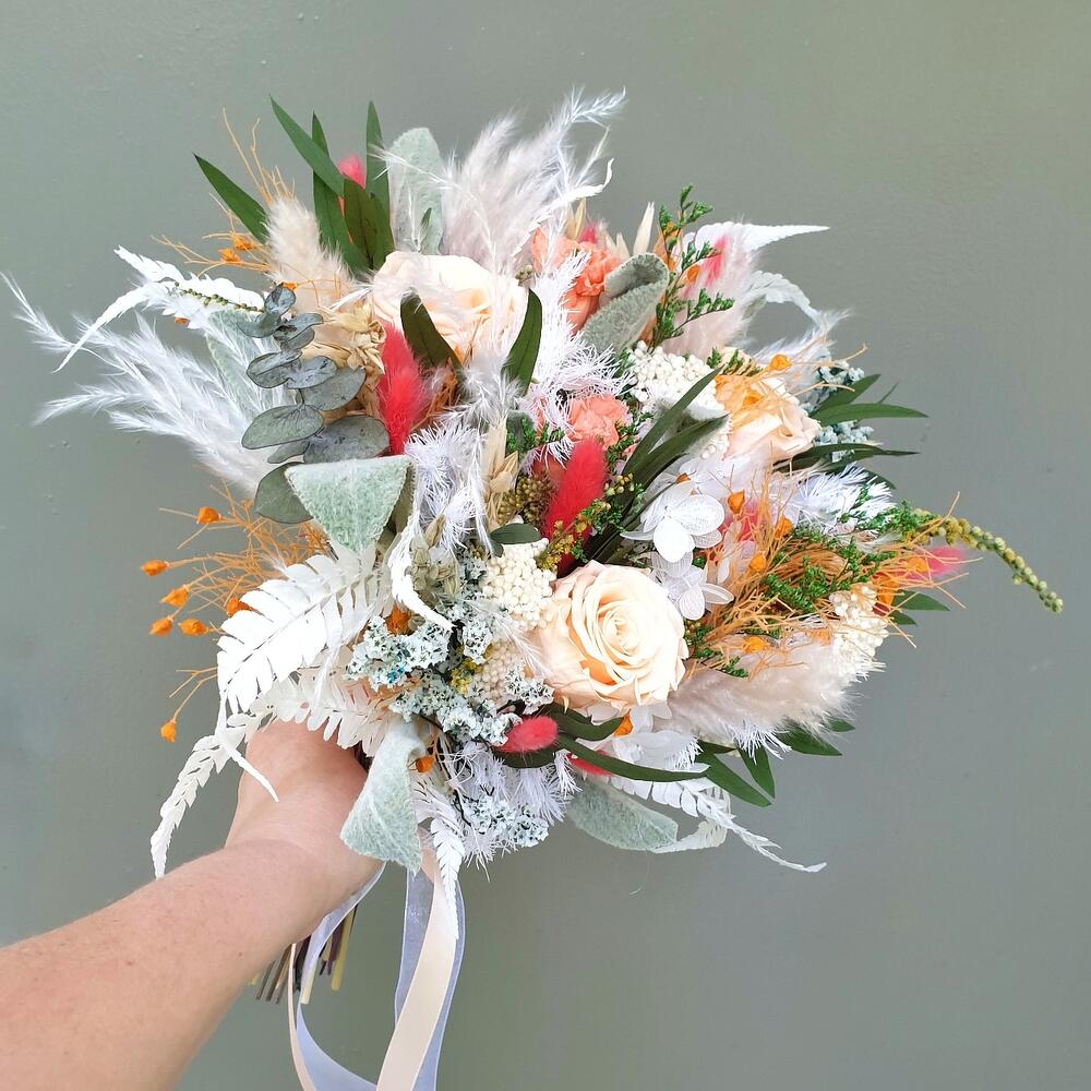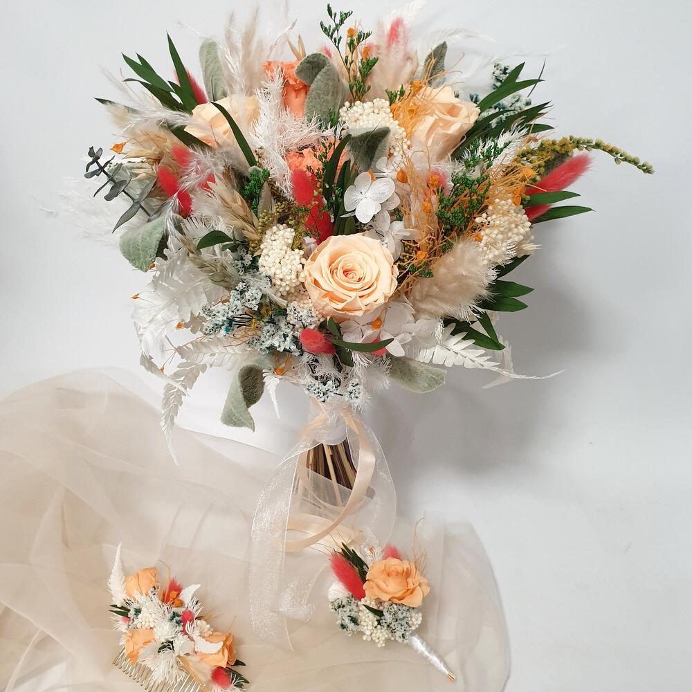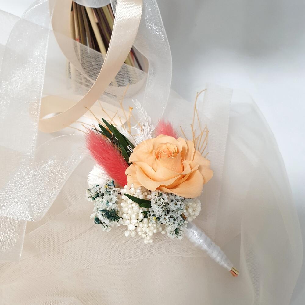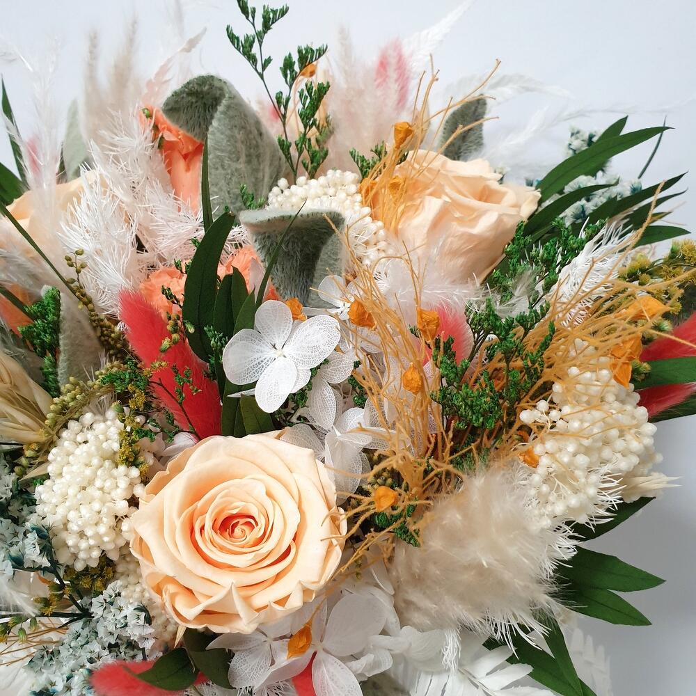 Стабилизированные цветы прекрасный вариант свадебного букета. Такие букеты очень лёгкие и невесте не составит труда держать букет. После свадьбы невеста сможет долгое время наслаждаться красотой букета. Не ставить на солнечные места и около отопительных приборов. Не поливать. Не опрыскивать водой. Возможно изготовление в нужной вам цветовой гамме.