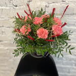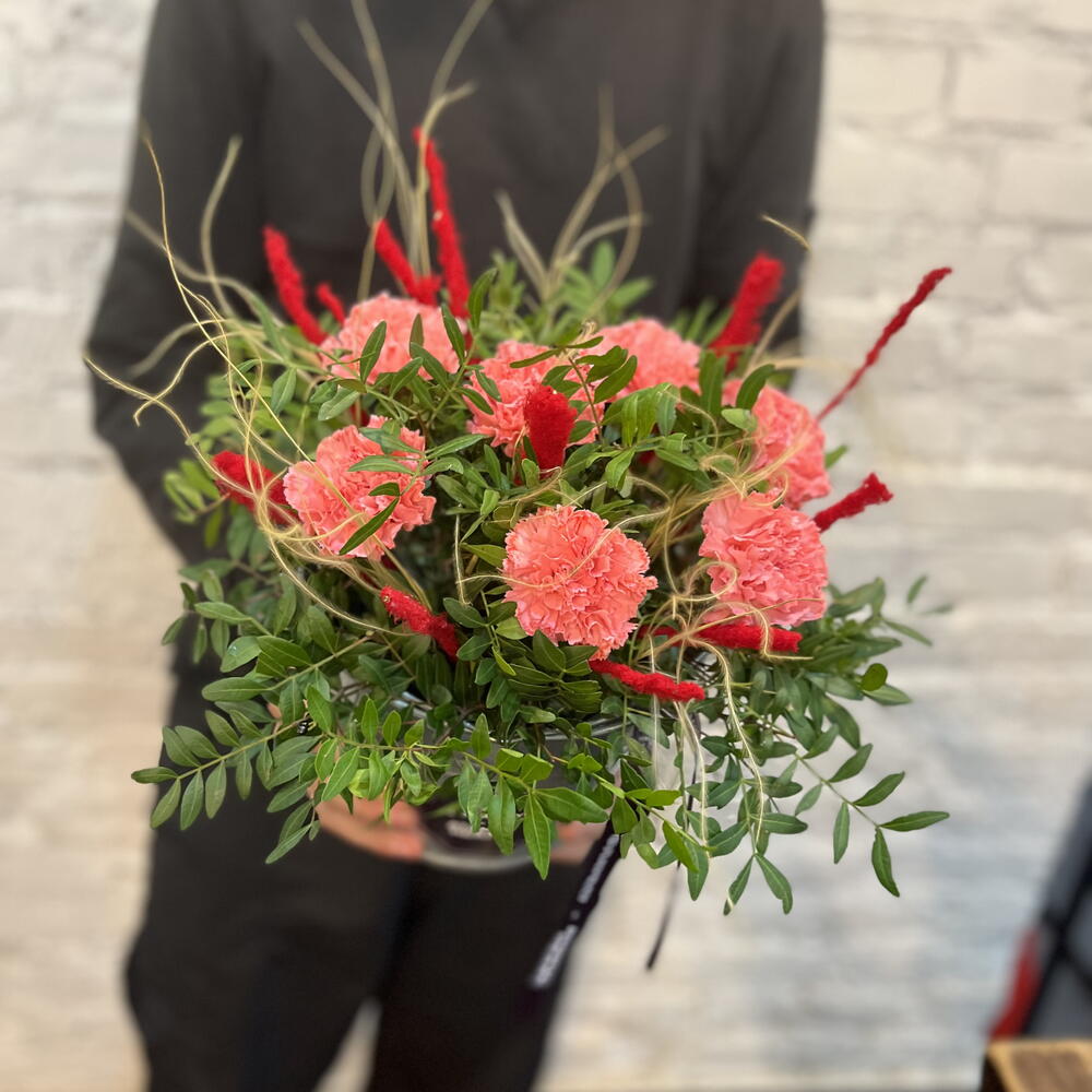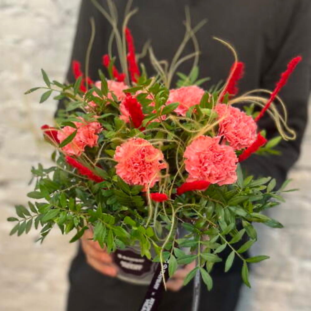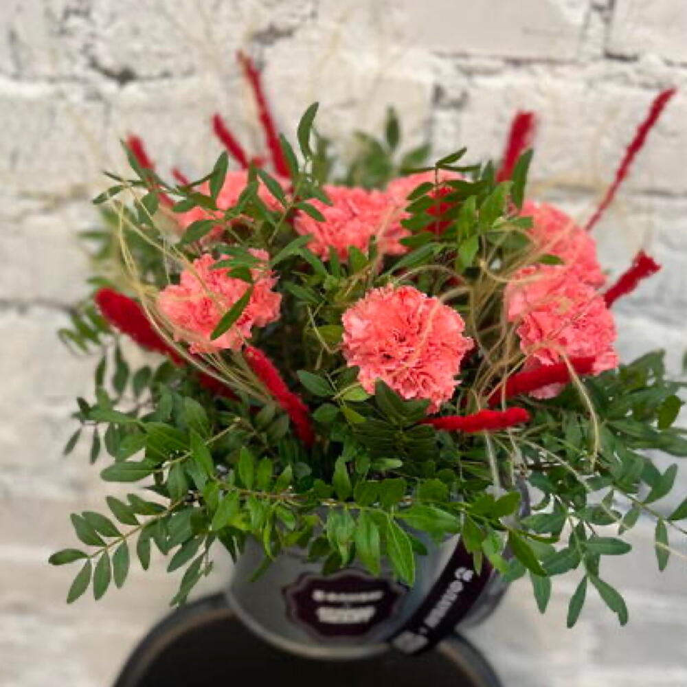 Диантус - 7 шт. Фисташка - 6 шт. Оазис флористический - 1 шт. ведро жестяное - 1 шт. декоративные ветки - 7 шт. брендированная лента - 1 шт. брендированная наклейка - 1 шт.