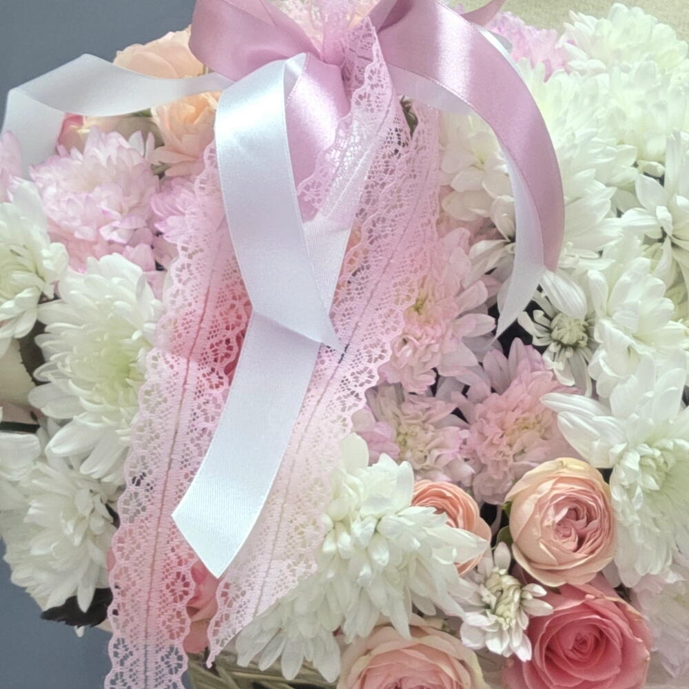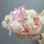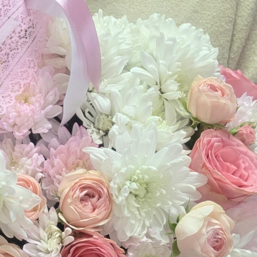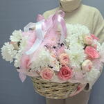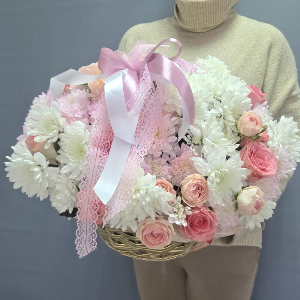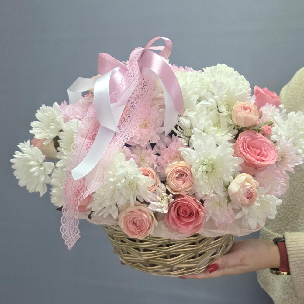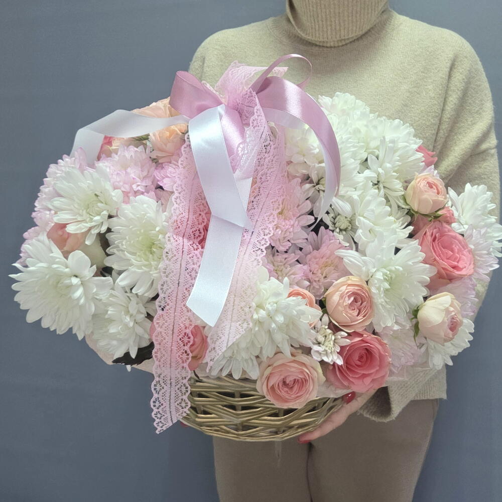 Светленькая корзина с кустовой белой хризантемой, кустовой розовой розой, розовой розой