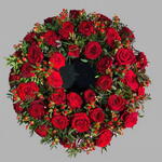 Круглый траурный венок из красных роз и гиперикума