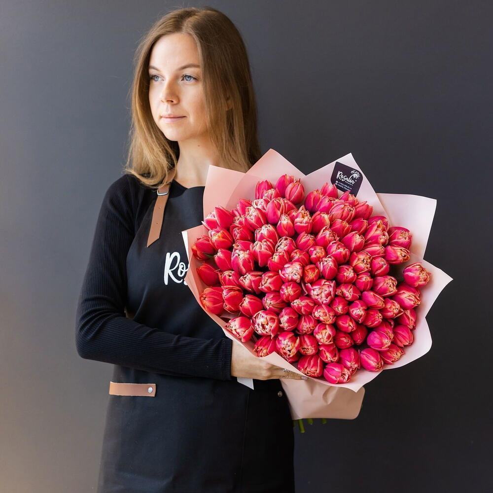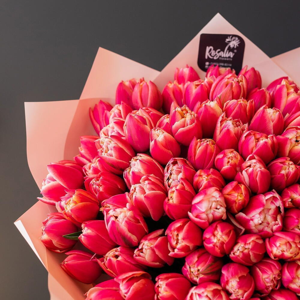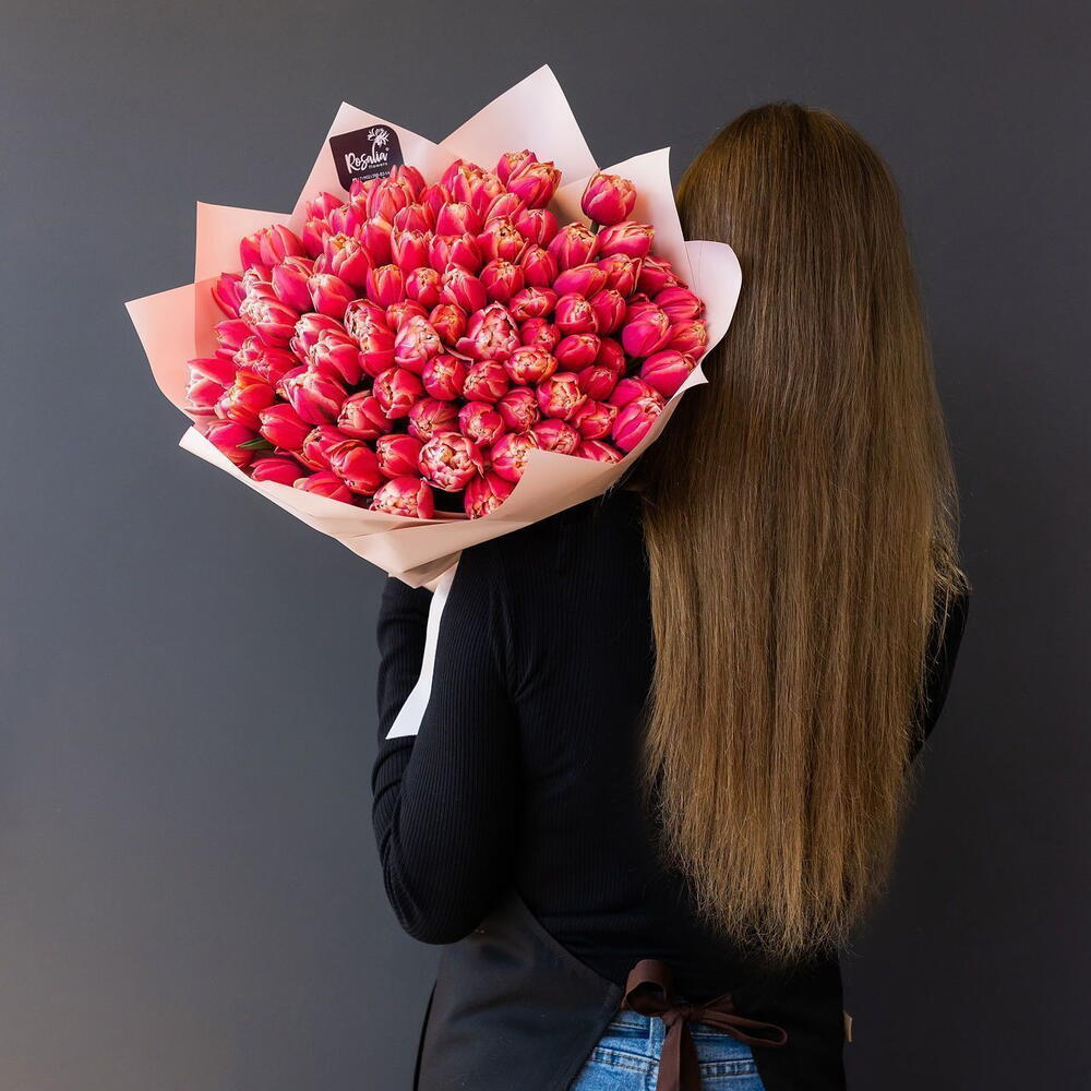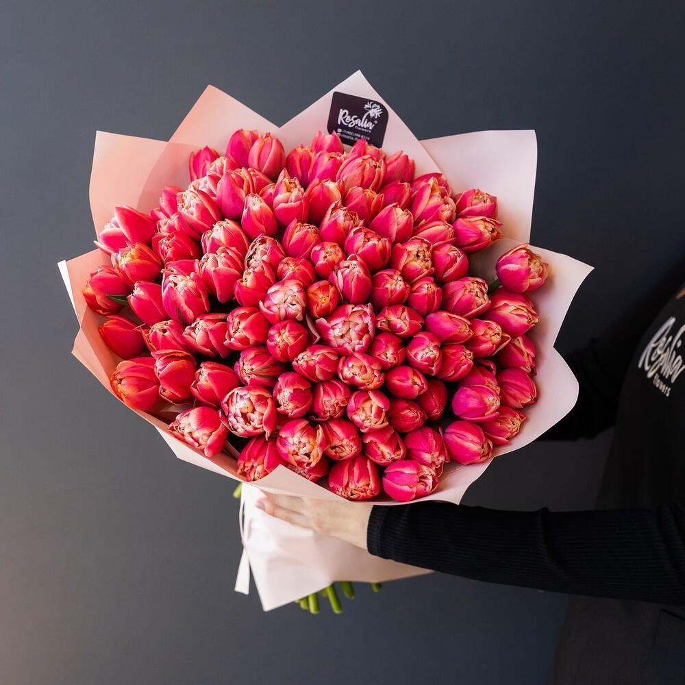 Монобукет из 101 шт пионовидных тюльпанов Доставляется в транспортировочной коробке Состав: упаковка пленка матовая, тюльпаны Ширина, см: 60 Длина, см: 60 Высота, см: 50 Вес: 0.9 кг..