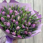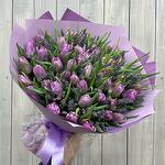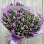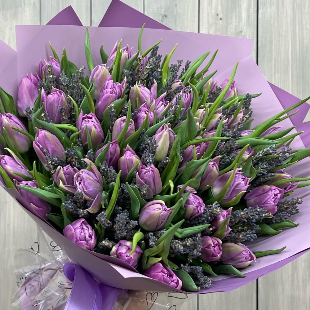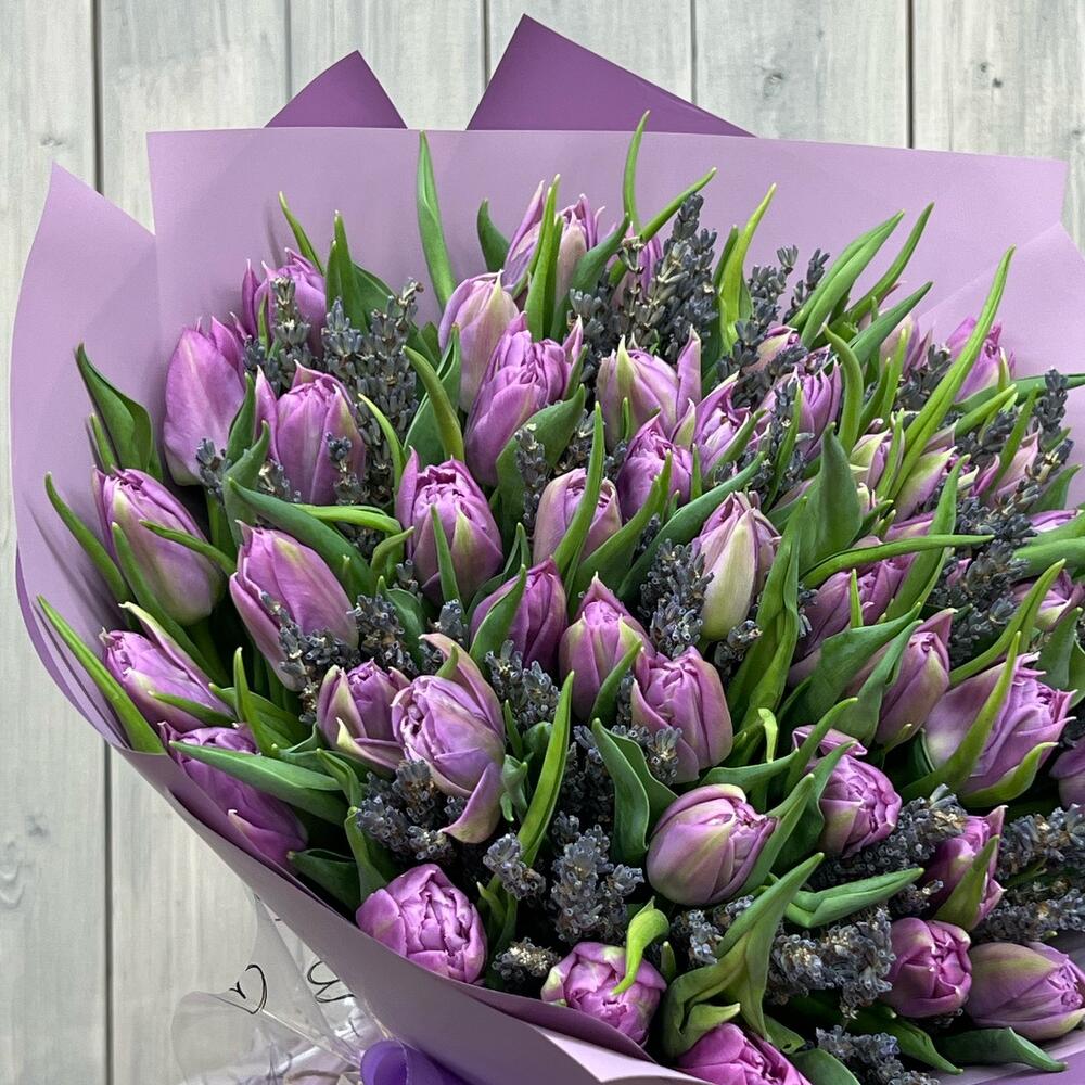 Лента атласная - 1 шт. Открытка - 1 шт. Тюльпан Пионовидный - 49 шт. Дизайнерская упаковка - 1 шт. аквабокс с водой - 1 шт. лаванда (сухоцвет) ароматная пучок - 1 шт.