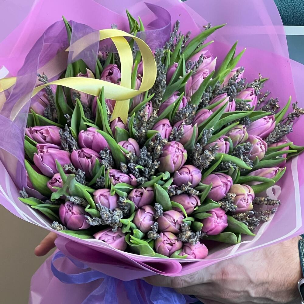 Лента атласная - 1 шт. Открытка - 1 шт. Лаванда (сухоцвет) пучок - 1 шт. Транспортировочная коробка - 1 шт. Дизайнерская упаковка - 1 шт. аквабокс с водой - 1 шт. тюльпан дабл прайс голландия - 49 шт.