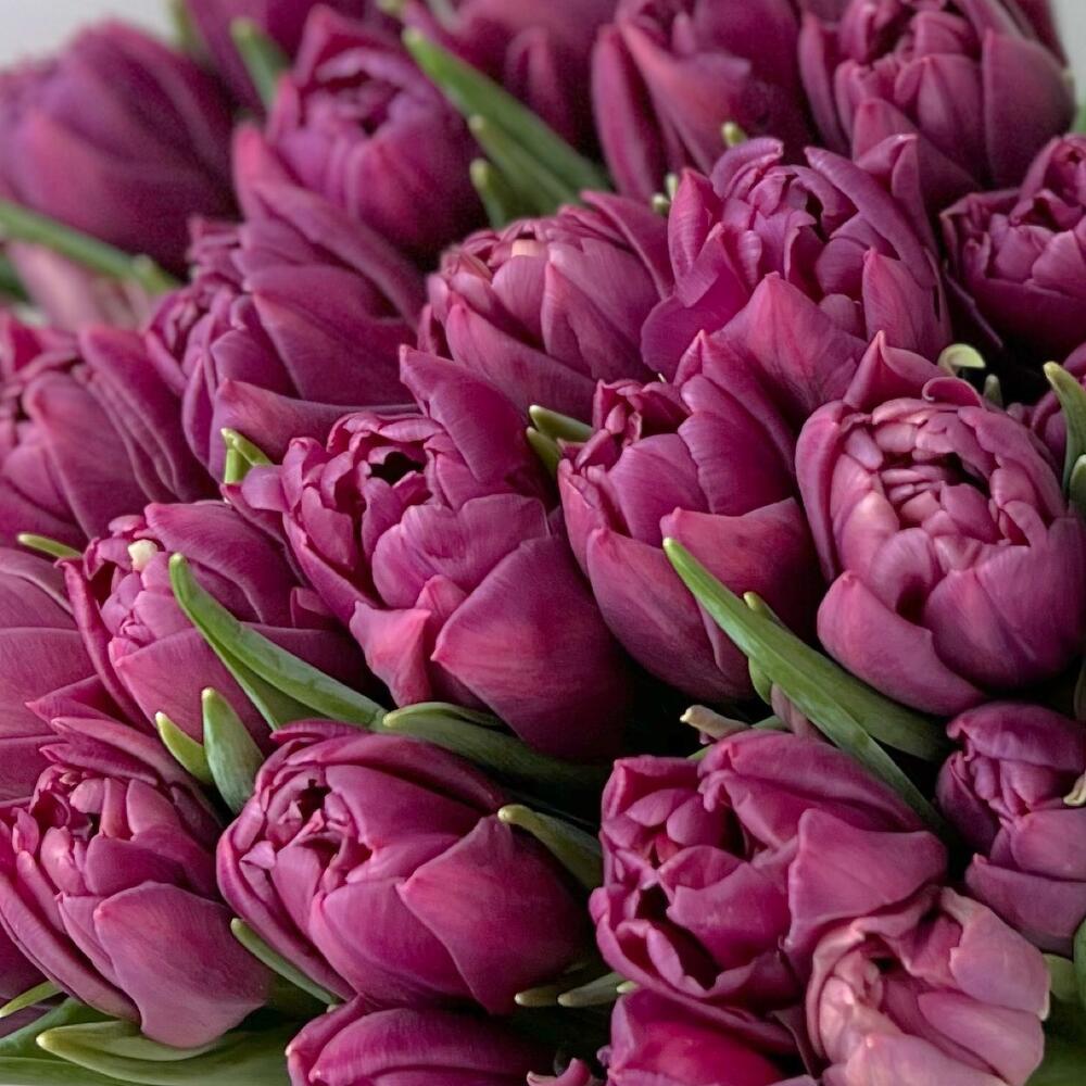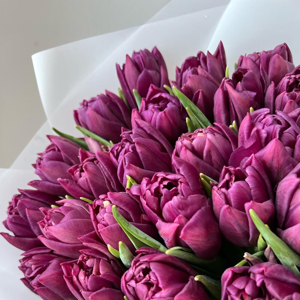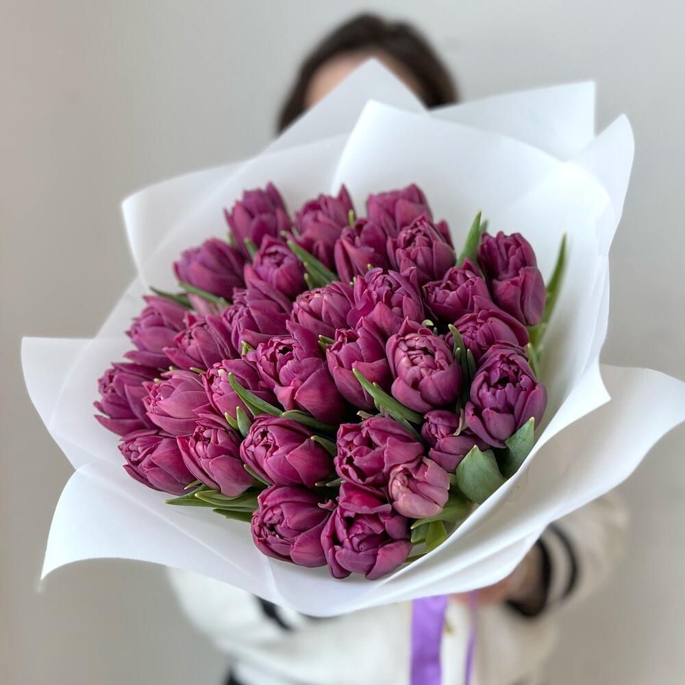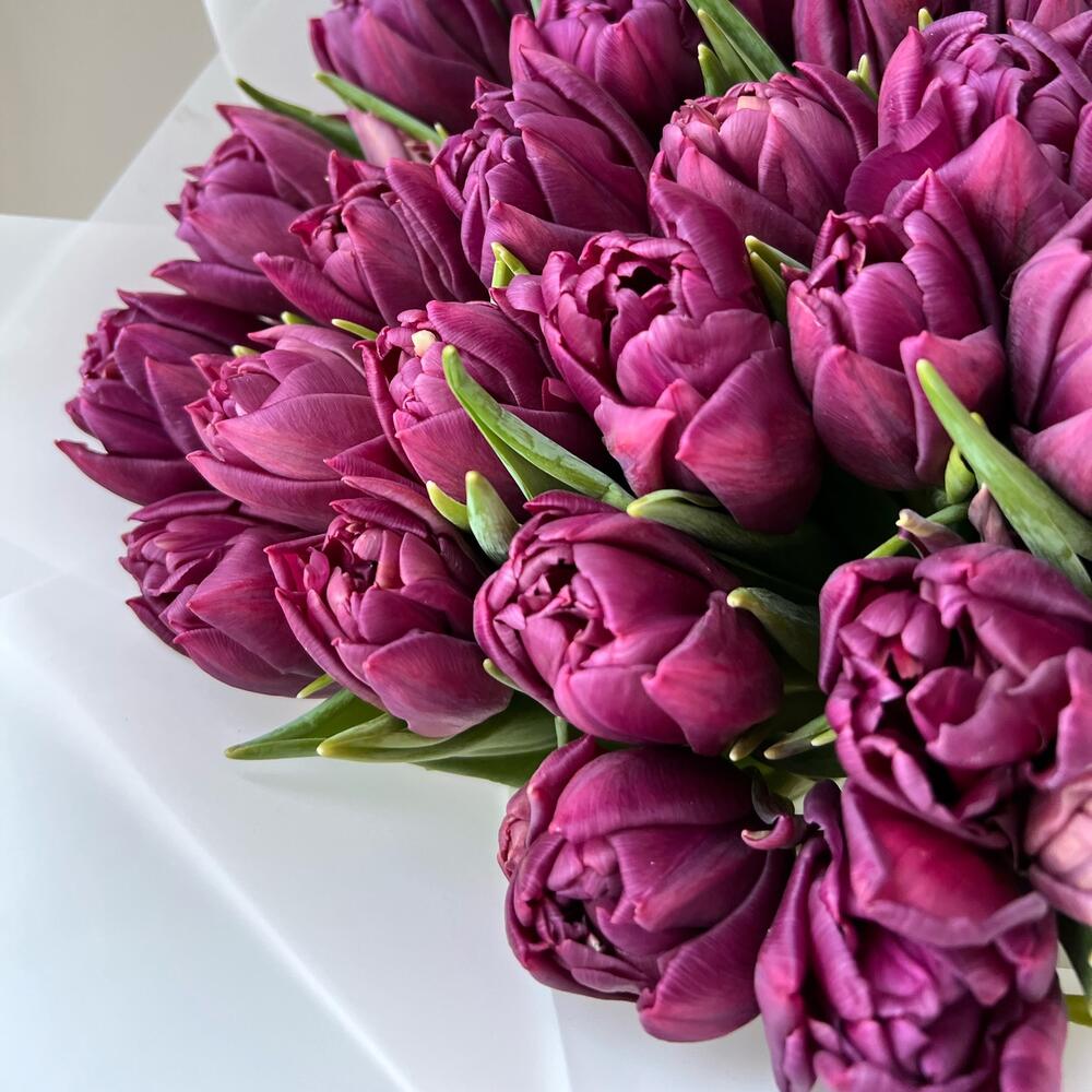 Стильный букет из 35 пионовидных тюльпанов в белой матовой упаковке. Соберём с любовью,доставим вовремя!