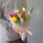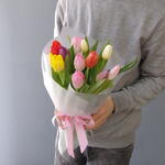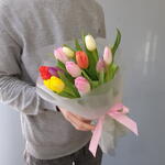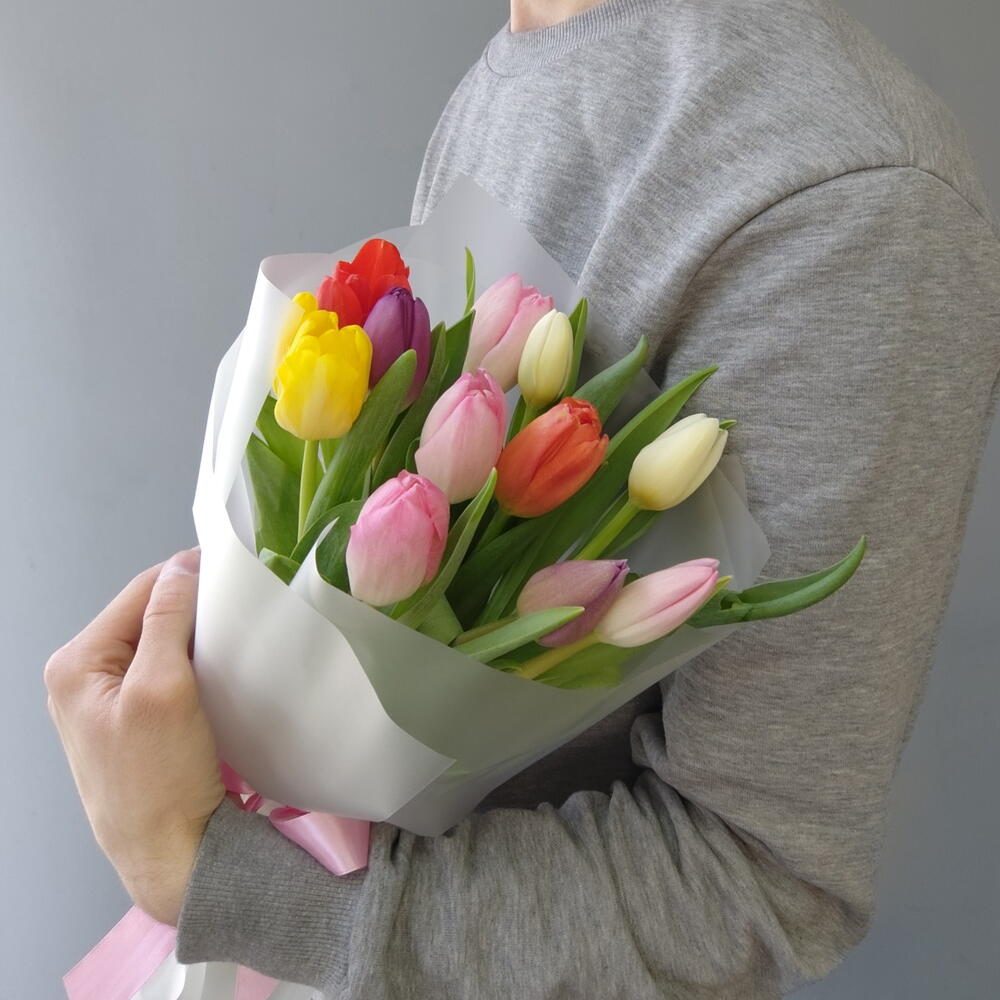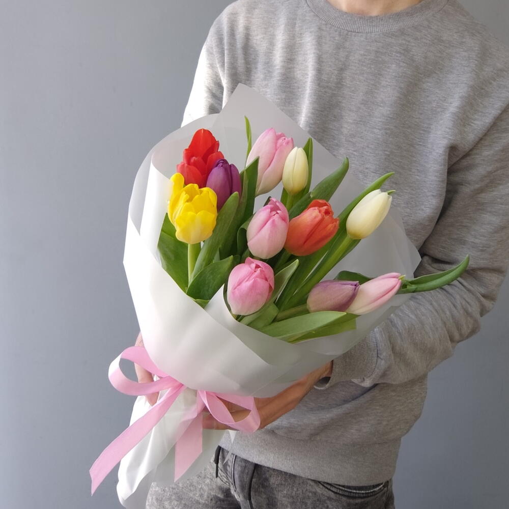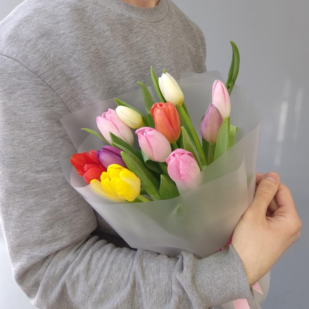 Яркий микс из 11 тюльпанов в матовой полупрозрачной плёнке С заботой к вашему букету: ✅Выбираем самые красивые цветы ✅Учитываем ваши пожелания ✅Присылаем фото перед отправкой ✅К каждому букету кладём пакетик средства для сохранения свежести цветов (кризал) Как ухаживать за цветами? Придерживайтесь следующих рекомендаций: 1) При выборе места размещения вазы придерживайтесь некоторых важных правил. Не размещайте её у каких-либо отопительных приборов, под прямыми солнечными лучами, на сквозняке и у фруктов. В помещении необходим оптимальный климат. Большинство цветов не выносят жаркие и душные помещения. 2) Подрежьте стебли чистым и острым секатором или ножом под углом 45 градусов. Для тюльпанов, ирисов, гербер и других похожих цветов - 90 градусов. Не рекомендуется использовать ножницы. 3) Поставьте букет в достаточное количество свежей и холодной воды. 4) Важно следить, чтобы листва не попадала в воду, поэтому лишние листья у стеблей лучше удалять. 5) Добавьте в воду пакетик средства для сохранения свежести цветов (кризал). Перед этим внимательно прочитайте к нему инструкцию. 6) Обновлять срез стеблей и менять воду в вазе необходимо раз в 1-2 дня, при этом не забывайте промывать вазу изнутри с моющим средством. Соблюдение рекомендаций по уходу позволит надолго сохранить ваш букет свежим и красивым. В этот список мы включили лишь общие правила по уходу, так как для каждого цветка есть свои тонкости ‼️ просим обратить ваше внимание, что тюльпаны могут немного отличаться по цветовой гамме, все зависит от поставки ‼️