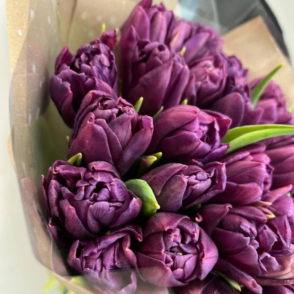 Лента атласная - 1 шт. Крафт упаковка - 3 шт. Пленка прозрачная - 2 шт. тюльпаны пионовидные - 25 шт.
