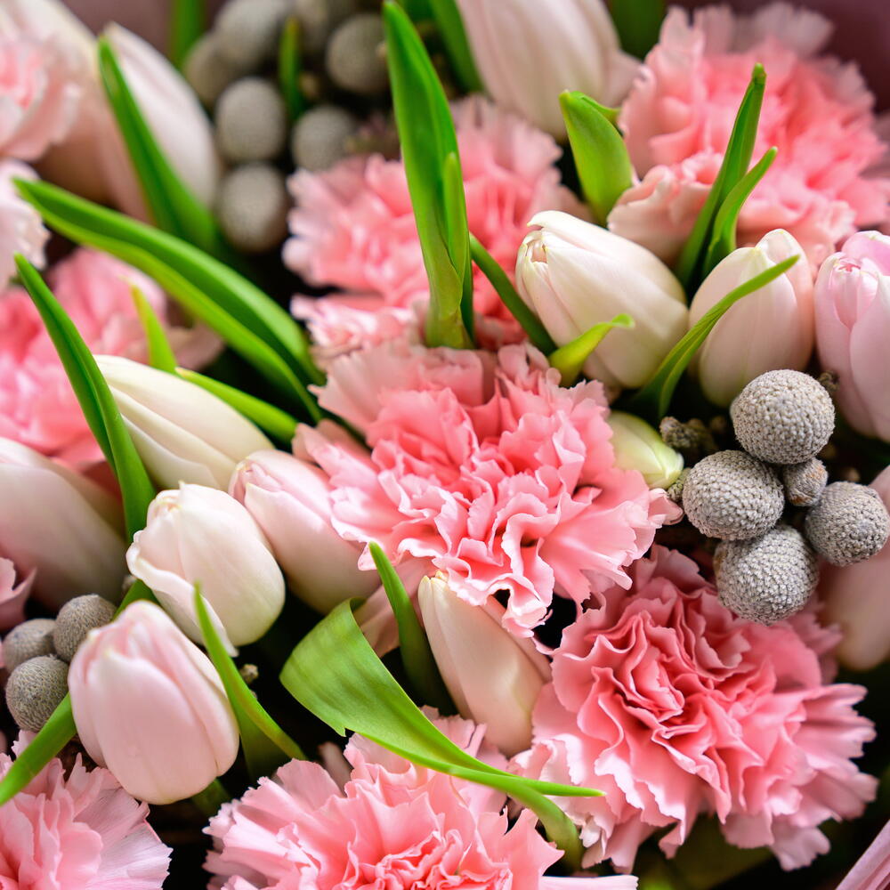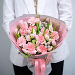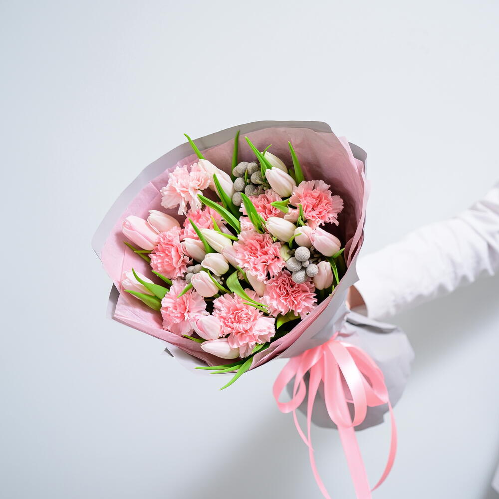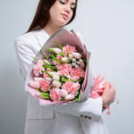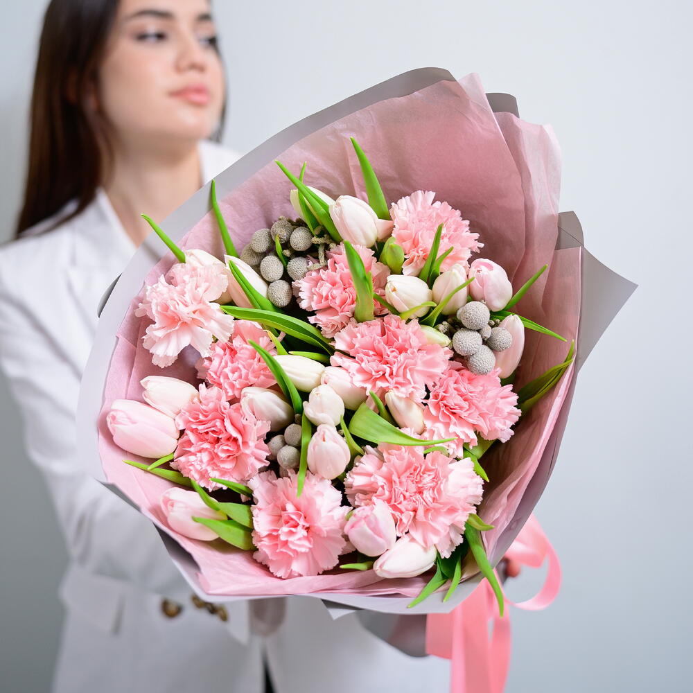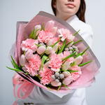 Бруния - 2 шт. Тюльпан - 19 шт. Диантус - 9 шт. Упаковка дизайнерская - 2 шт.