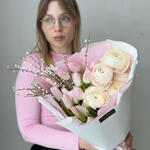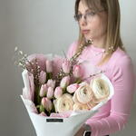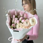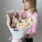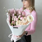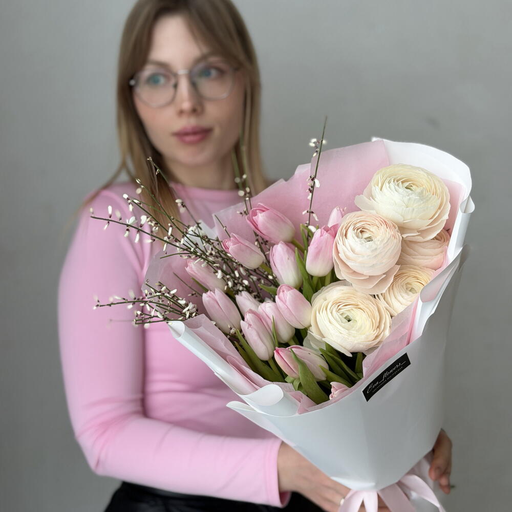 Этот нежный и стильный букет включает в себя красивые тюльпаны, ранункулусы и генисту, которые создают яркое и изящное сочетание цветов. Он упакован в элегантную дизайнерскую упаковку и украшен атласной лентой, что делает его идеальным подарком для особых моментов в жизни.