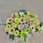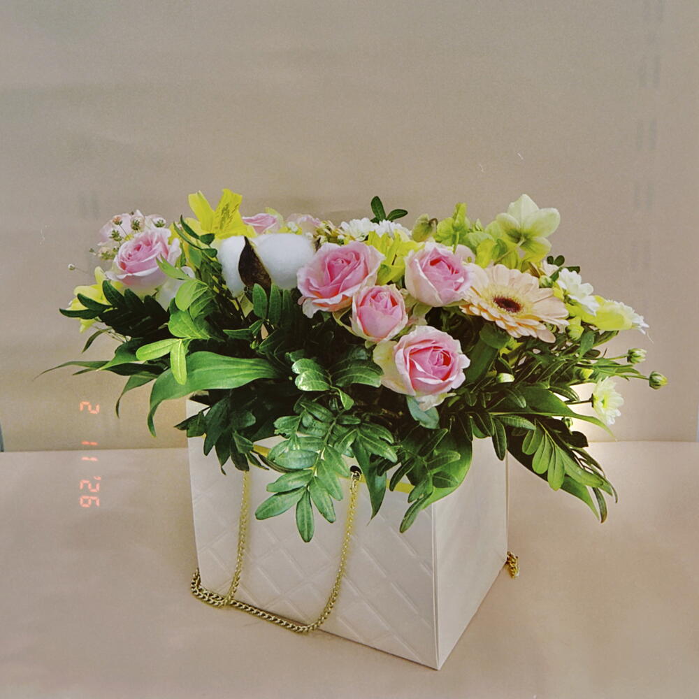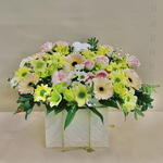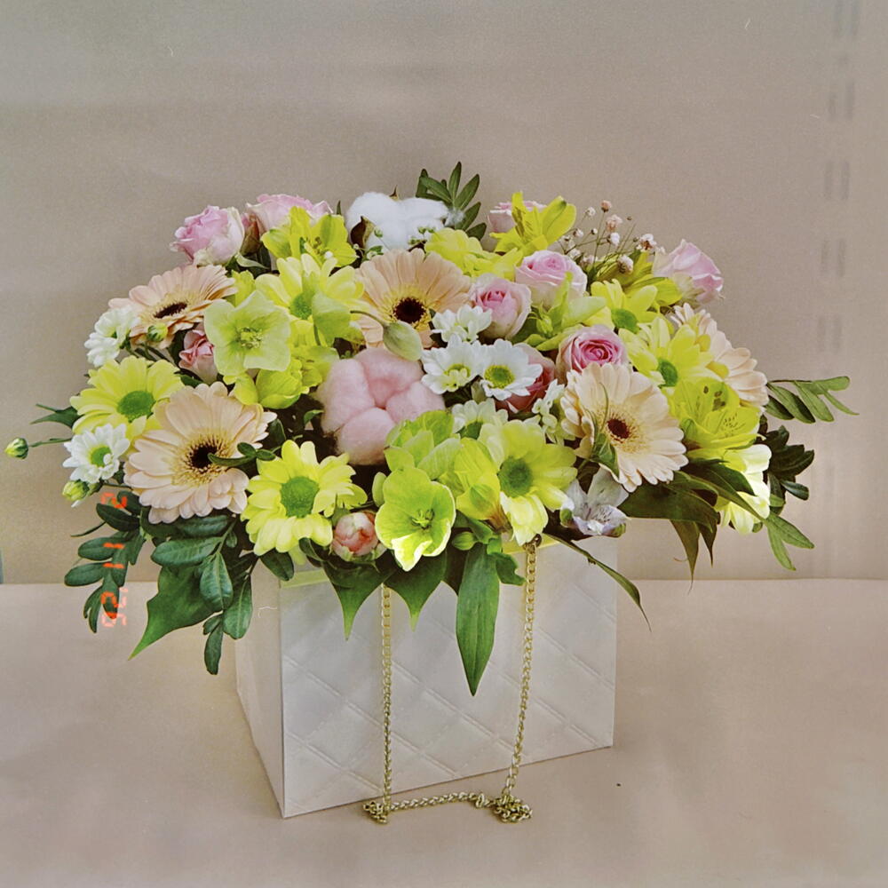 Альстромерия - 3 шт. Гермини - 5 шт. Гипсофила - 1 шт. Роза кустовая - 3 шт. Рускус - 5 шт. Хлопок - 2 шт. Хризантема кустовая - 2 шт. Сантини - 2 шт. Фисташка - 2 шт. Морозник - 3 шт.