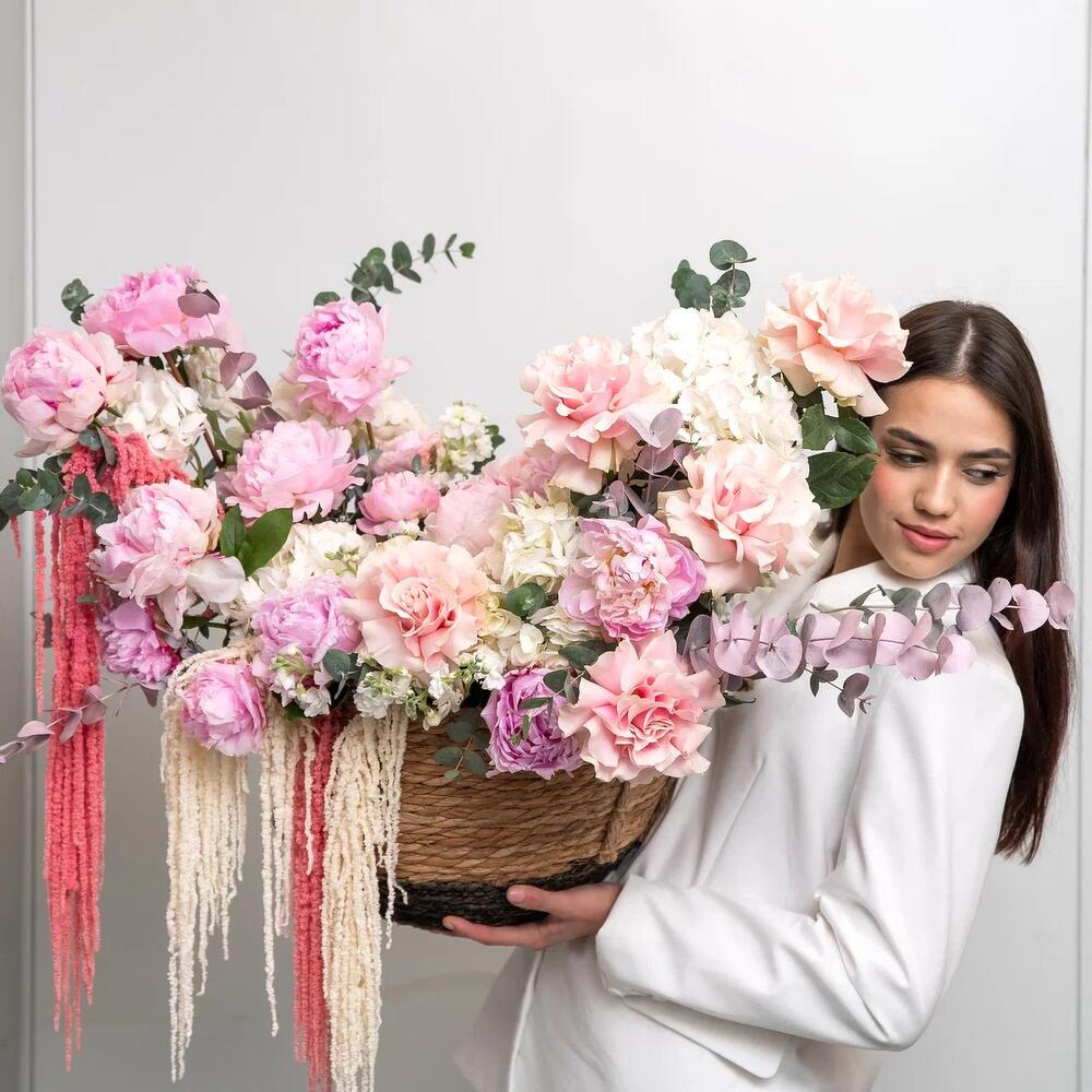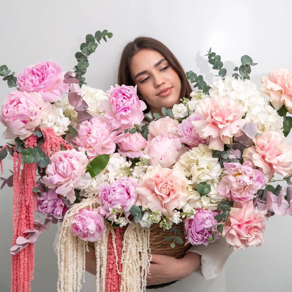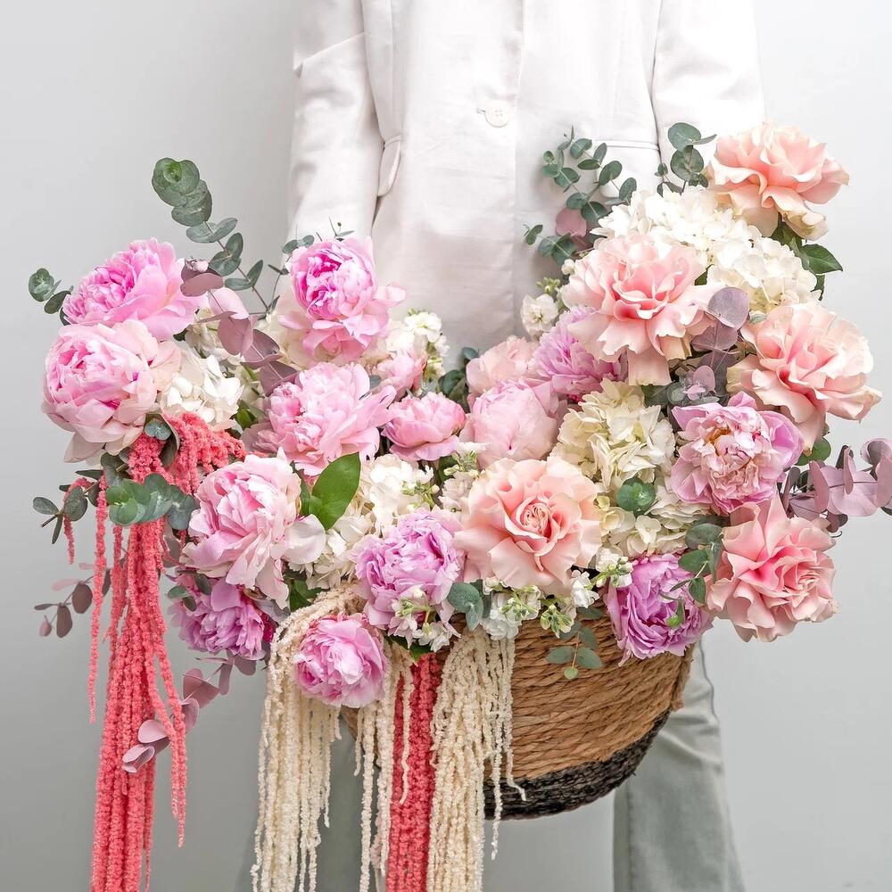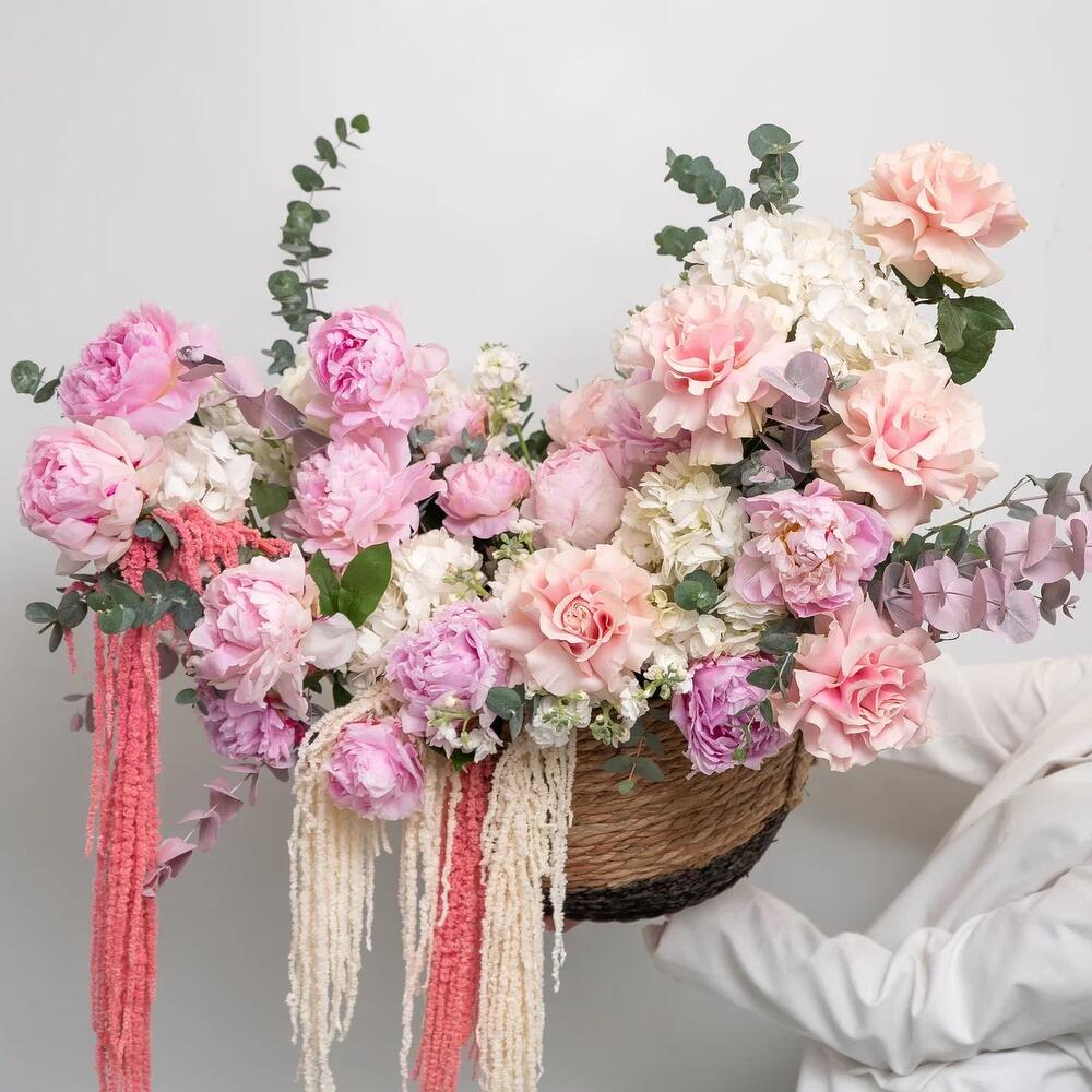 Невероятная премиум композиция в плетеной корзине с роскошными пионами, гортензией и французской розой 💕 Незабываемой подарок по любому случаю и поводу для ваших любимых💕