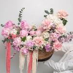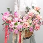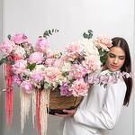 Гортензия - 5 шт. Маттиола - 15 шт. Пион - 15 шт. Амарант - 3 шт. Корзина плетеная - 1 шт. Роза французская - 5 шт. Эвкалипт Baby Blue - 10 шт.
