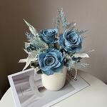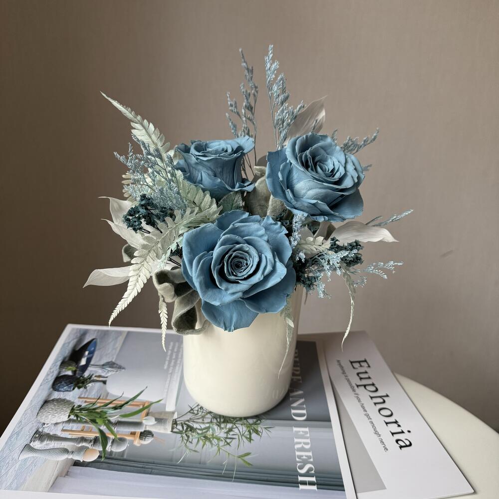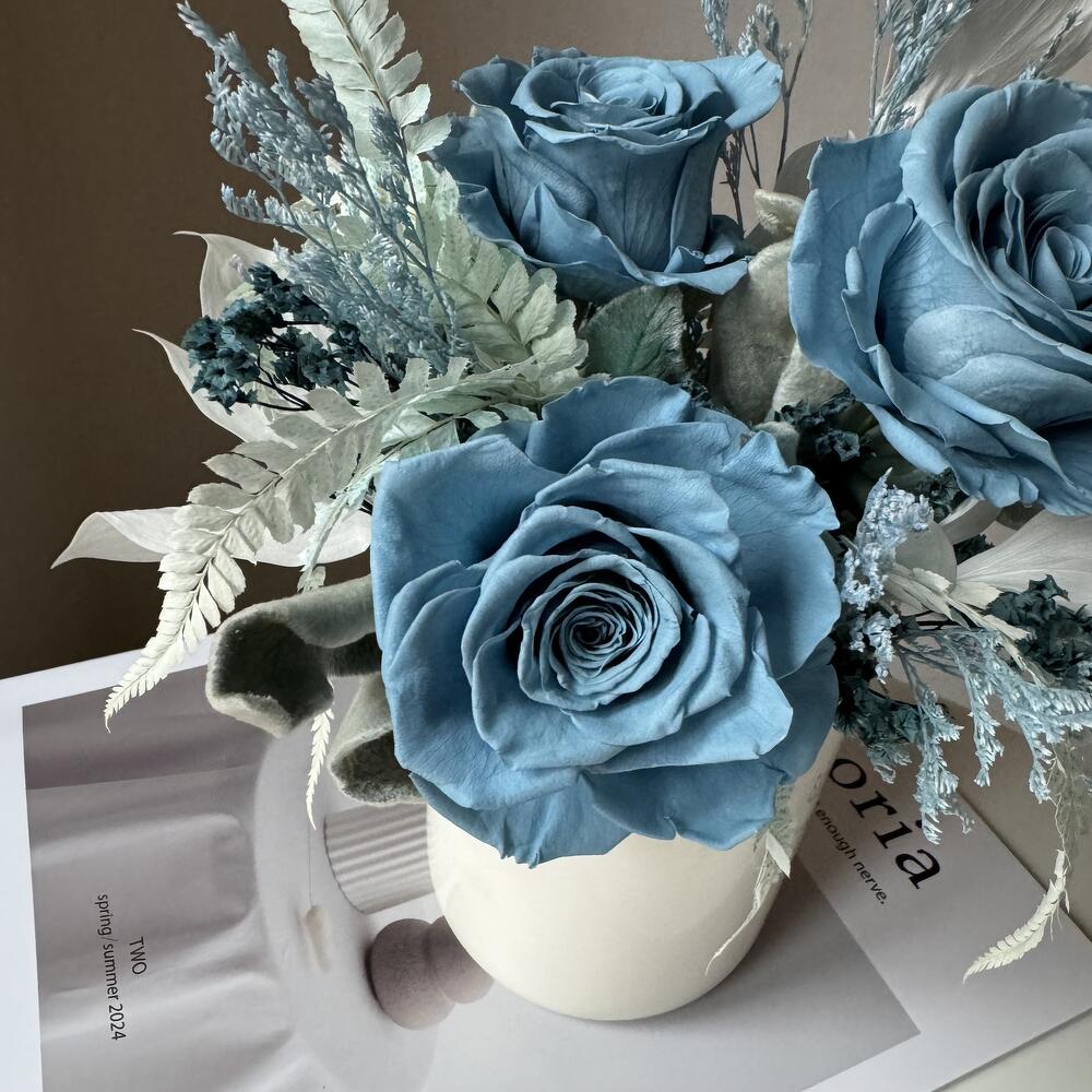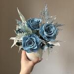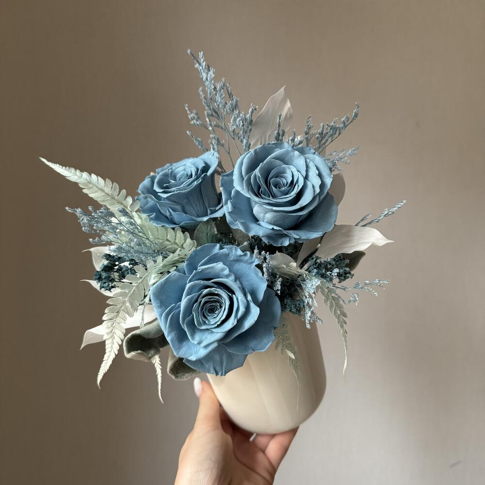 Композиция из стабилизированных классических роз собрана в керамическом молочно-белом кашпо. В составе классические розы пыльно синего цвета приятного для глаз, микс лимониумов, русскуса, папоротника, стахиса и других необычных цветоов. Хороший размер приятно презентовать, вау эффект подобного рода изделия обеспечен. Композиция прекрасно впишется в современный интерьер, дополнит его и украсит, станет его изюминкой. Сухоцветы и стабилизированные цветы это: 🌱натуральные растения 🌱не требующие сложного ухода и полива водой 🌱стойкость которых при должном уходе не менее года. Композиция доставляется в защищенном виде: подарочный крафт-пакет и хрустящая бумага тишью, в подарок идет инструкция по уходу и не большой вкусный презент.