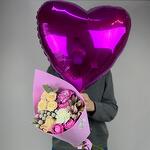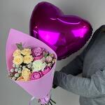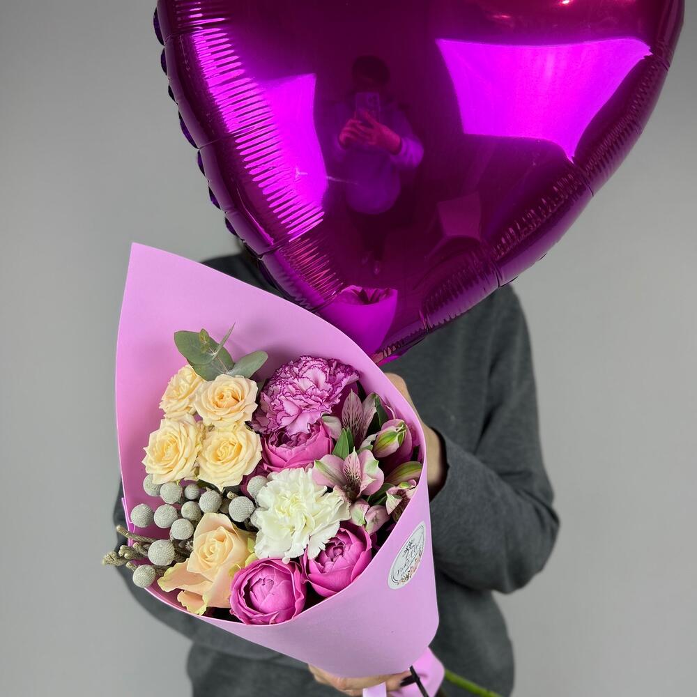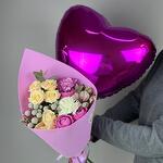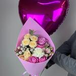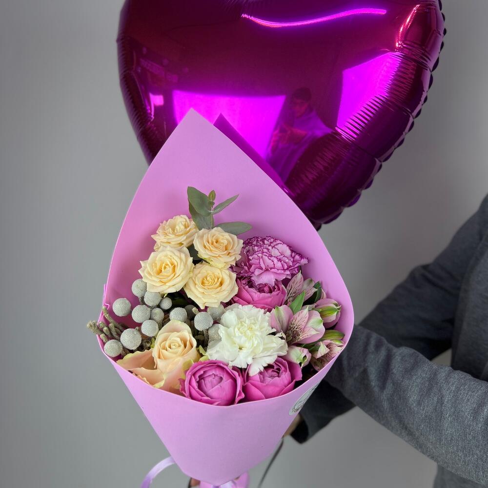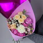 Альстромерия - 1 шт. Бруния - 1 шт. Эвкалипт - 1 шт. Роза - 1 шт. Кустовая роза - 1 шт. Диантус - 2 шт. Пионовидная роза - 1 шт. Упаковка фоамиран - 1 шт.