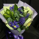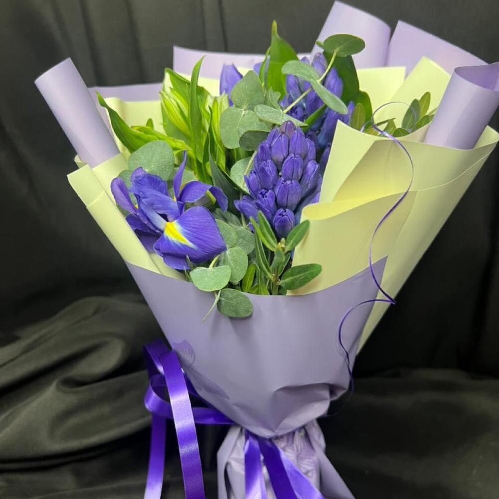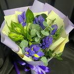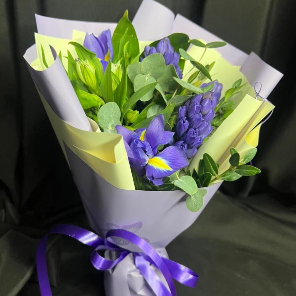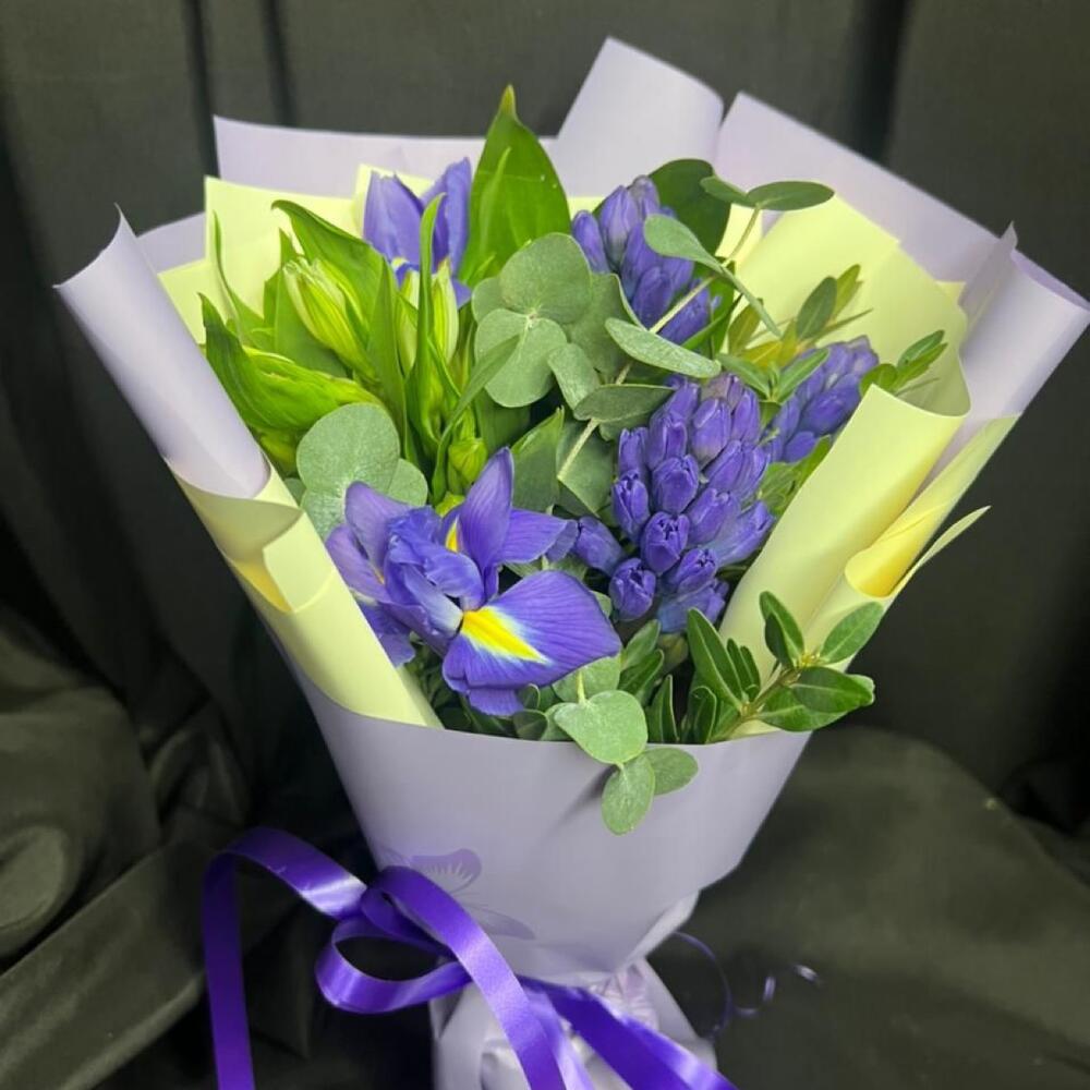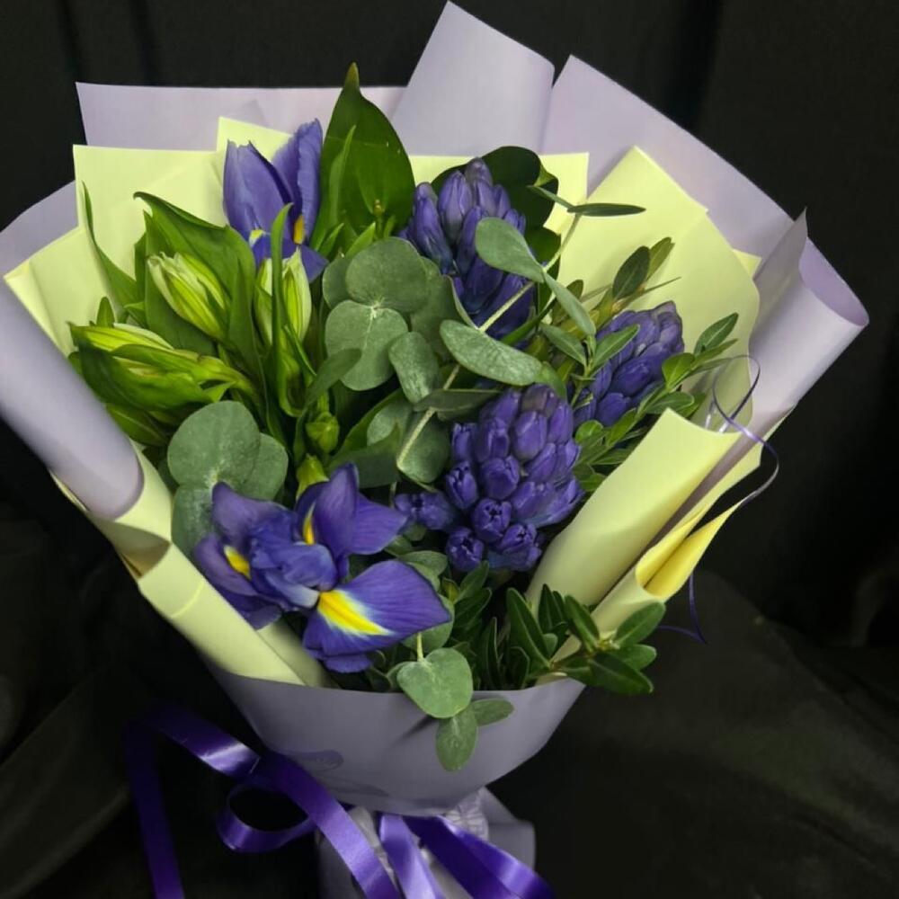 Лента - 1 шт. Эвкалипт - 1 шт. Ирис синий - 3 шт. Гиацинт синий - 3 шт. пленка матовая цветная - 1 шт. самшит зелень - 1 шт. альстромерия белая - 1 шт.