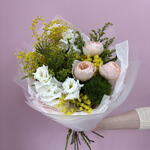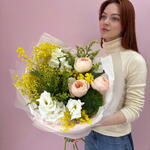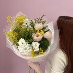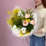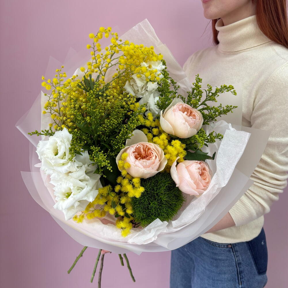 Лизиантус - 2 шт. Мимоза - 2 шт. Писташ - 1 шт. Солидаго - 2 шт. Упаковка дизайнерская - 1 шт. Роза Дэвида Остина - 3 шт. Диантус Green Trick - 1 шт.