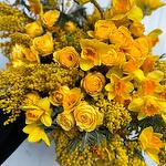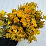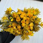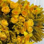 Лента атласная - 3 шт. Нарцисс Желтый - 25 шт. мимоза пучок - 3 шт. роза пионовидная yellow bubbles - 10 шт. настроение на весь день - 100000 шт.