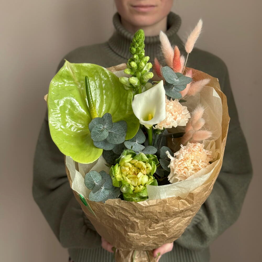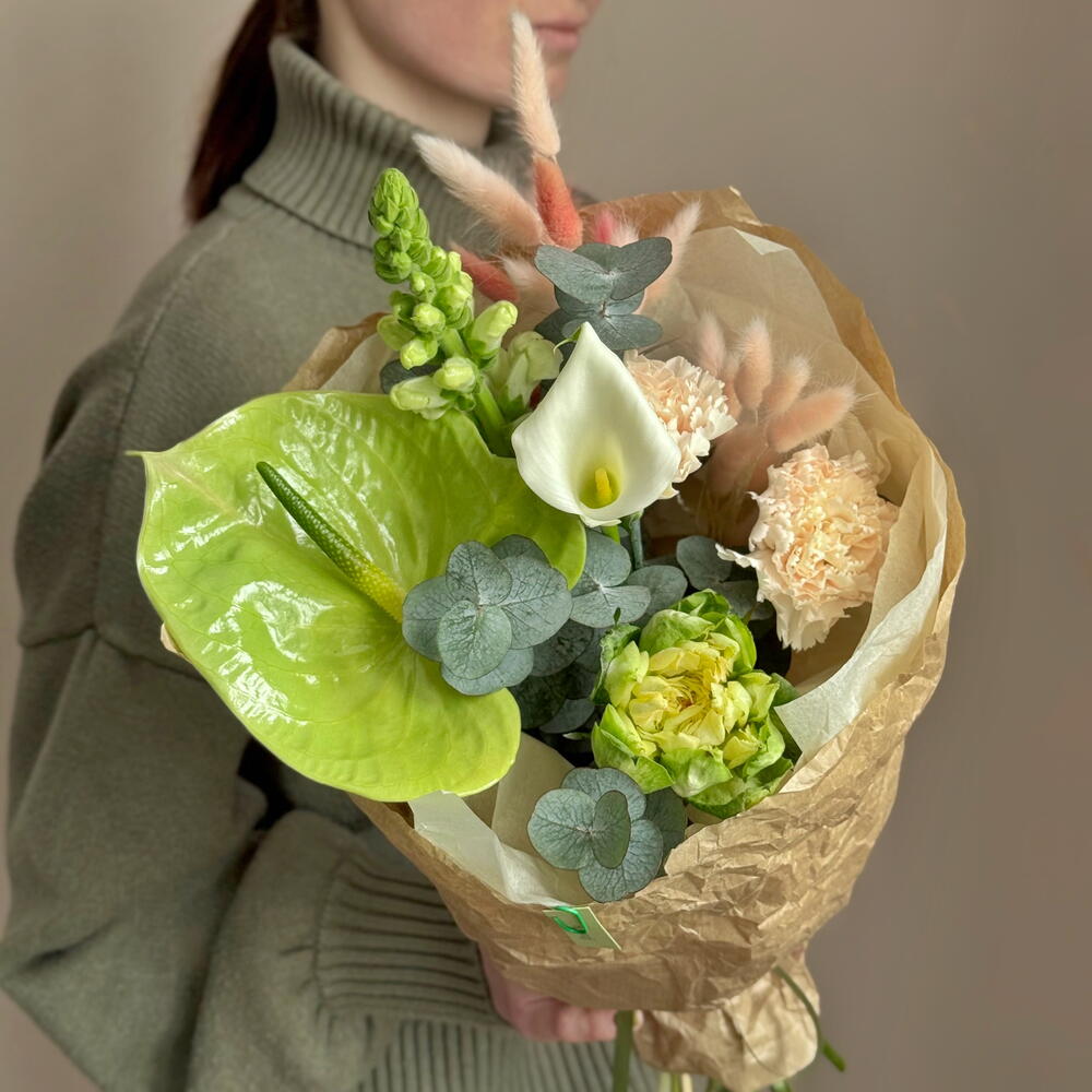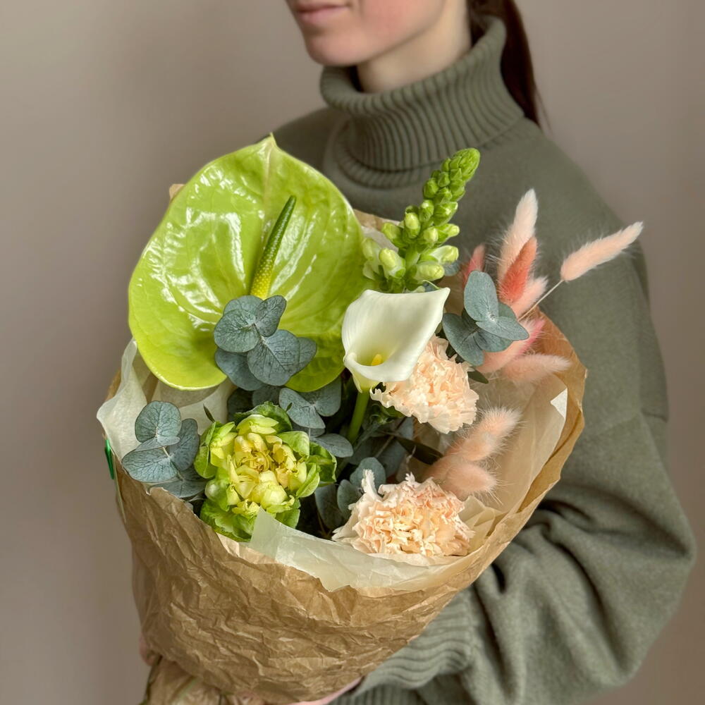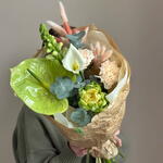 Антуриум - 1 шт. Калла - 1 шт. Эвкалипт - 1 шт. Тишью - 1 шт. Крафт - 1 шт. Аквабокс - 1 шт. Кризал (подкормка) - 1 шт. Лагурус - 2 шт. Диантус сортовой - 2 шт. бечевка натуральная - 1 шт. инструкция по уходу за цветами - 1 шт. сладкий подарок от магазина - 1 шт. пакет транспортировочный крафт - 1 шт.