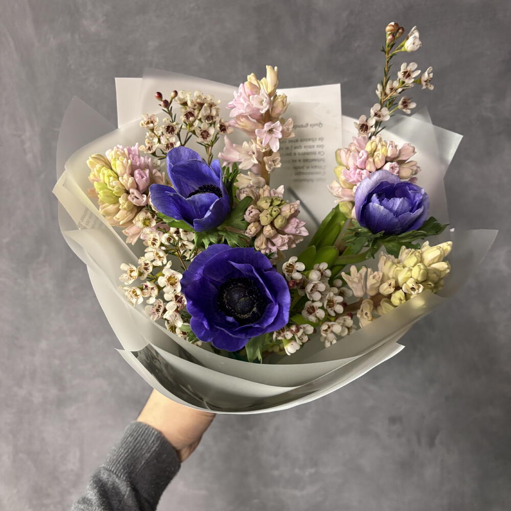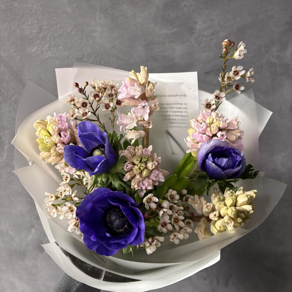 Весенний букет с ароматными гиацинтами и анемонами
