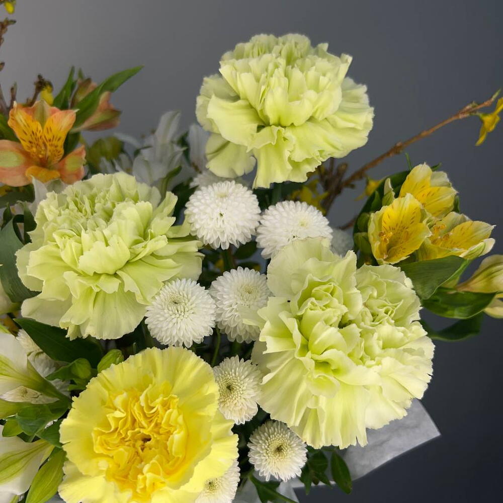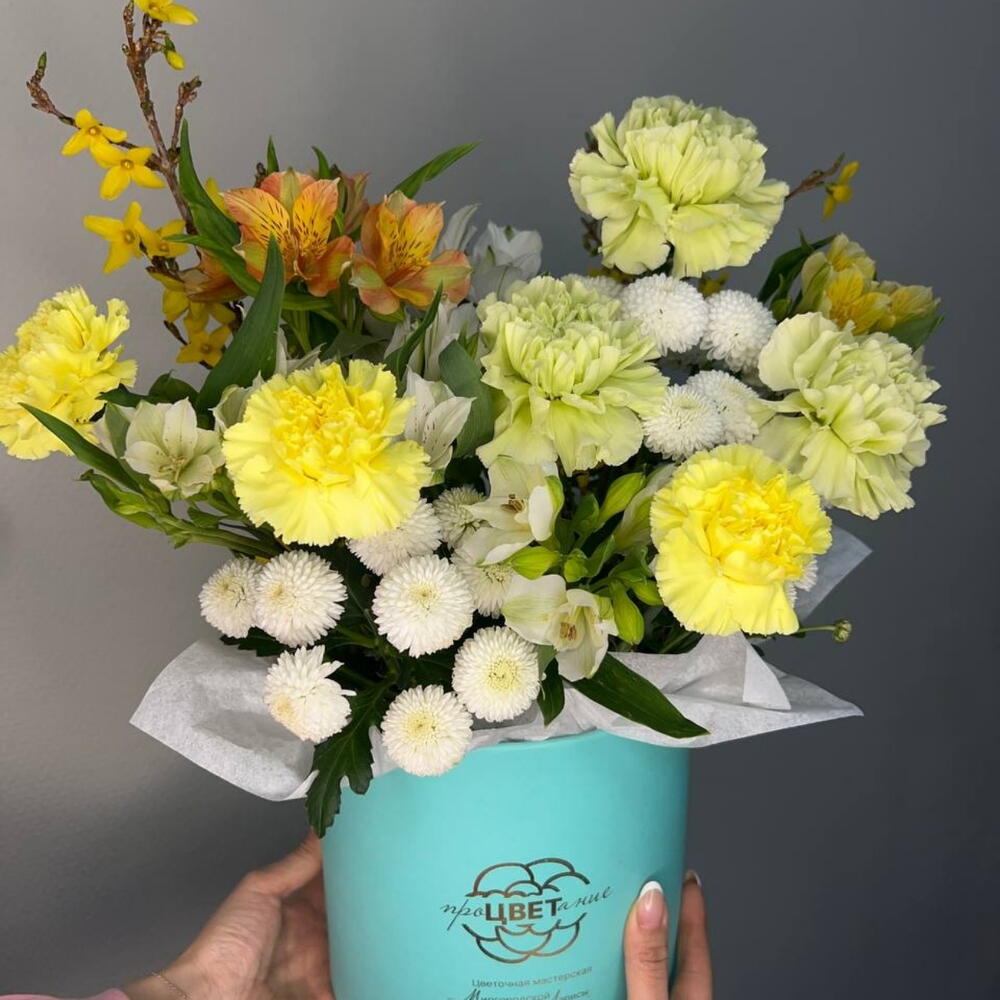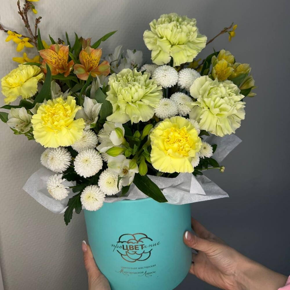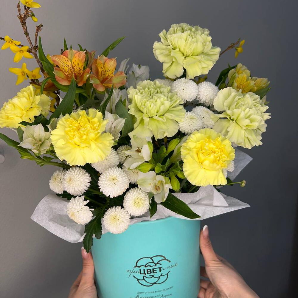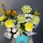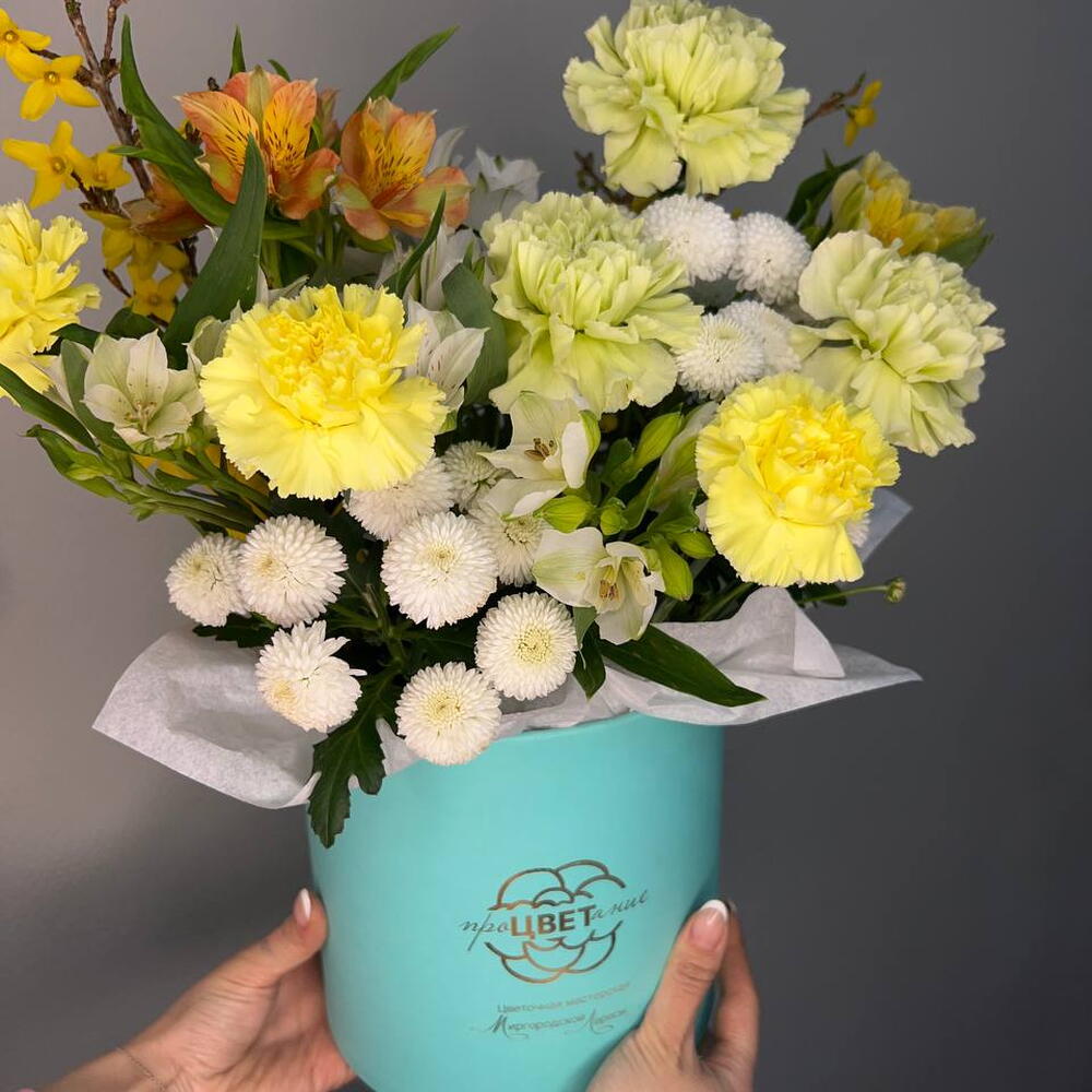 Альстромерия - 5 шт. Диантус - 6 шт. Коробка шляпная - 1 шт. Сантини - 2 шт. Форзиция - 1 шт. Оазис флористический - 1 шт.