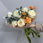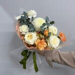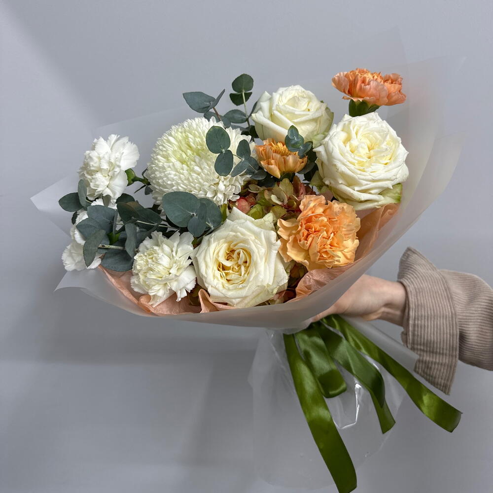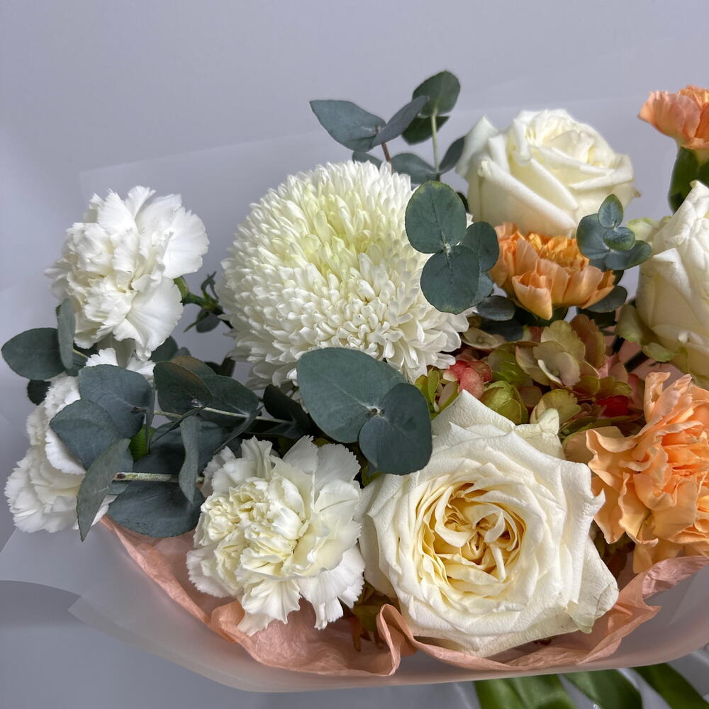 Гортензия - 1 шт. Гвоздика - 6 шт. Упаковка дизайнерская - 1 шт. Эвкалипт Цинерея - 2 шт. магнум - 1 шт. кенделайт роза - 3 шт.