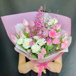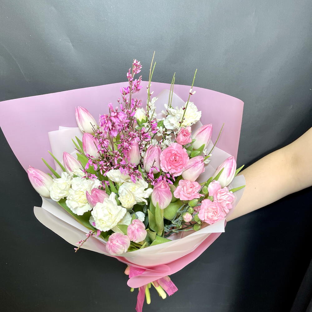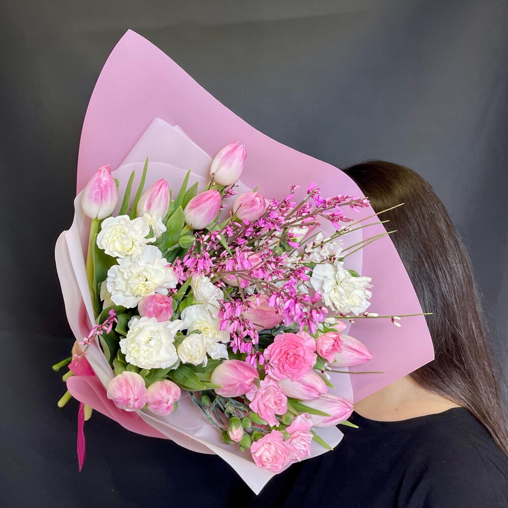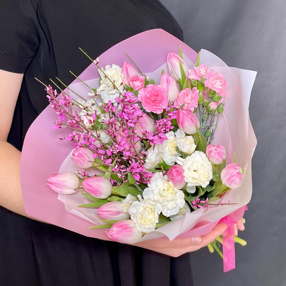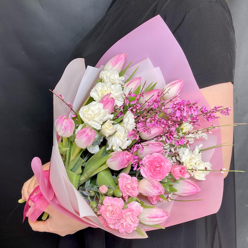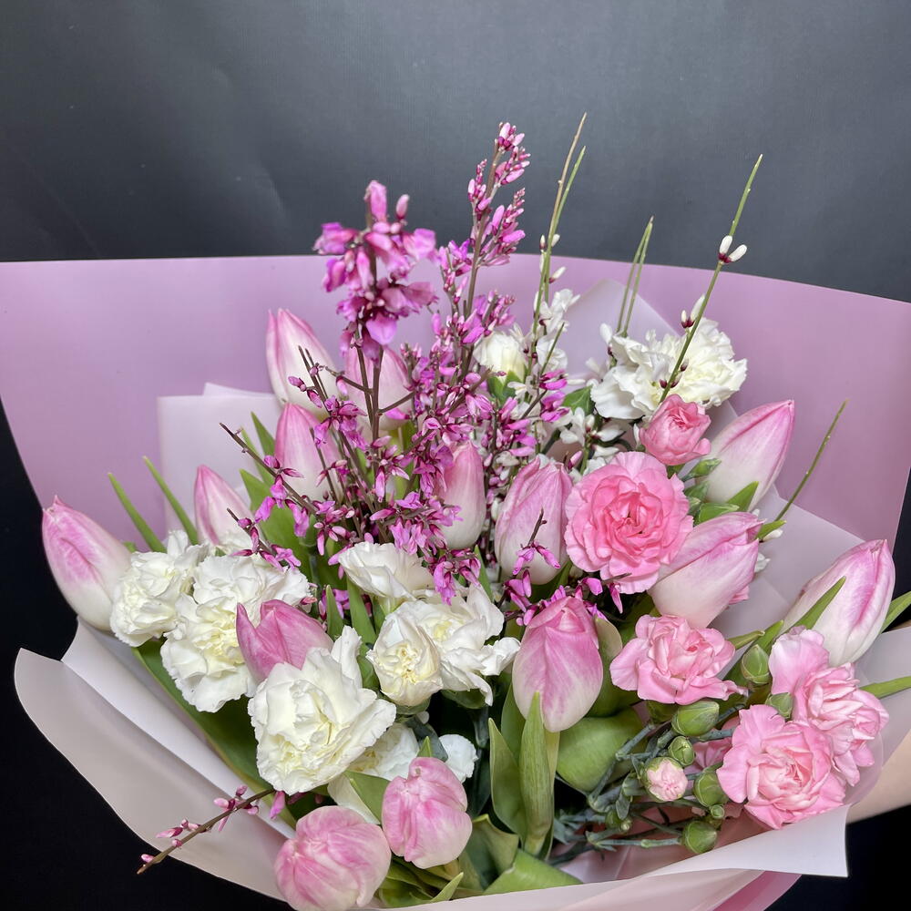 Весенняя нежность. Букет с тюльпанами, диантусами и генистой