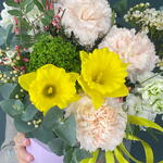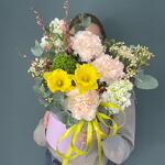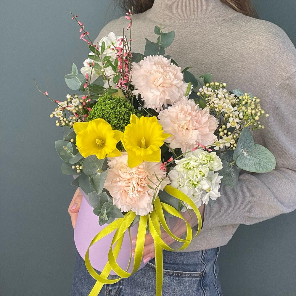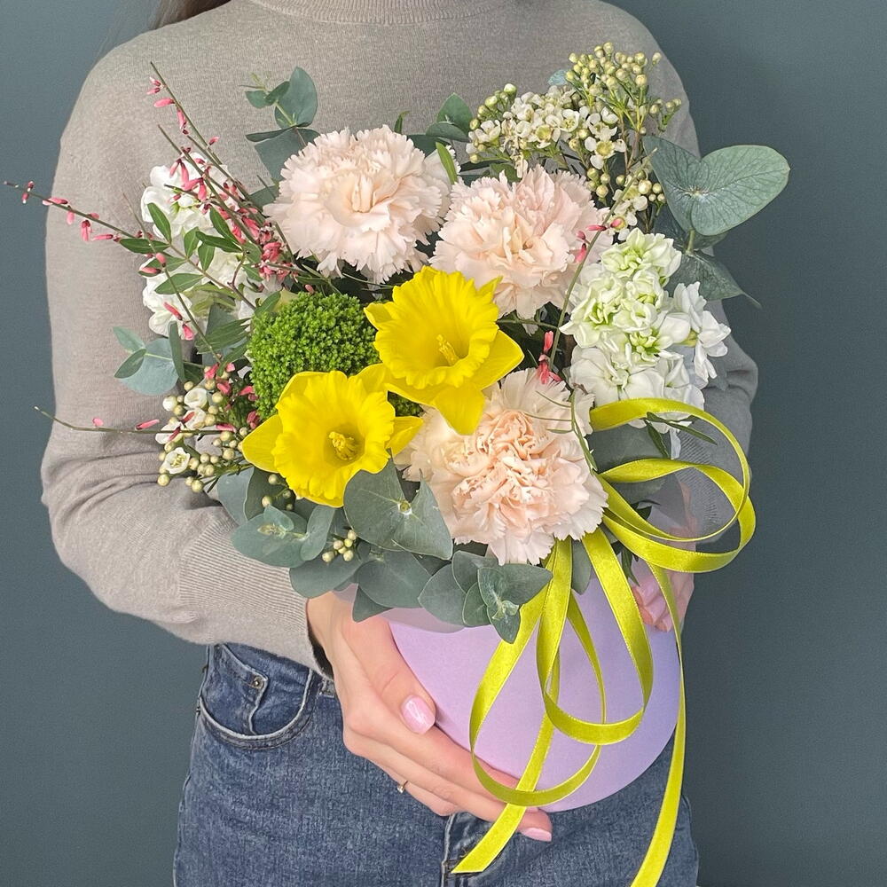 Маттиола - 1 шт. Нарцисс - 2 шт. Трахелиум - 1 шт. Эвкалипт - 3 шт. Лента атласная - 1 шт. Диантус - 3 шт. Коробка шляпная - 1 шт. Фисташка - 2 шт. Хамелациум Белый - 1 шт. Губка флористическая - 1 шт. генниста - 1 шт.